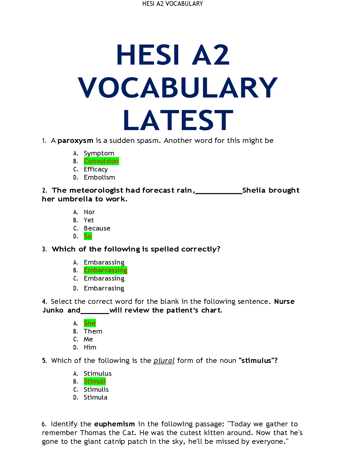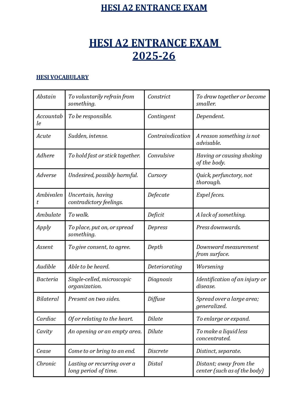 HESI A2 ENTRANCE EXAM 2025-26 Questions and answers with HESI VOCABULARY