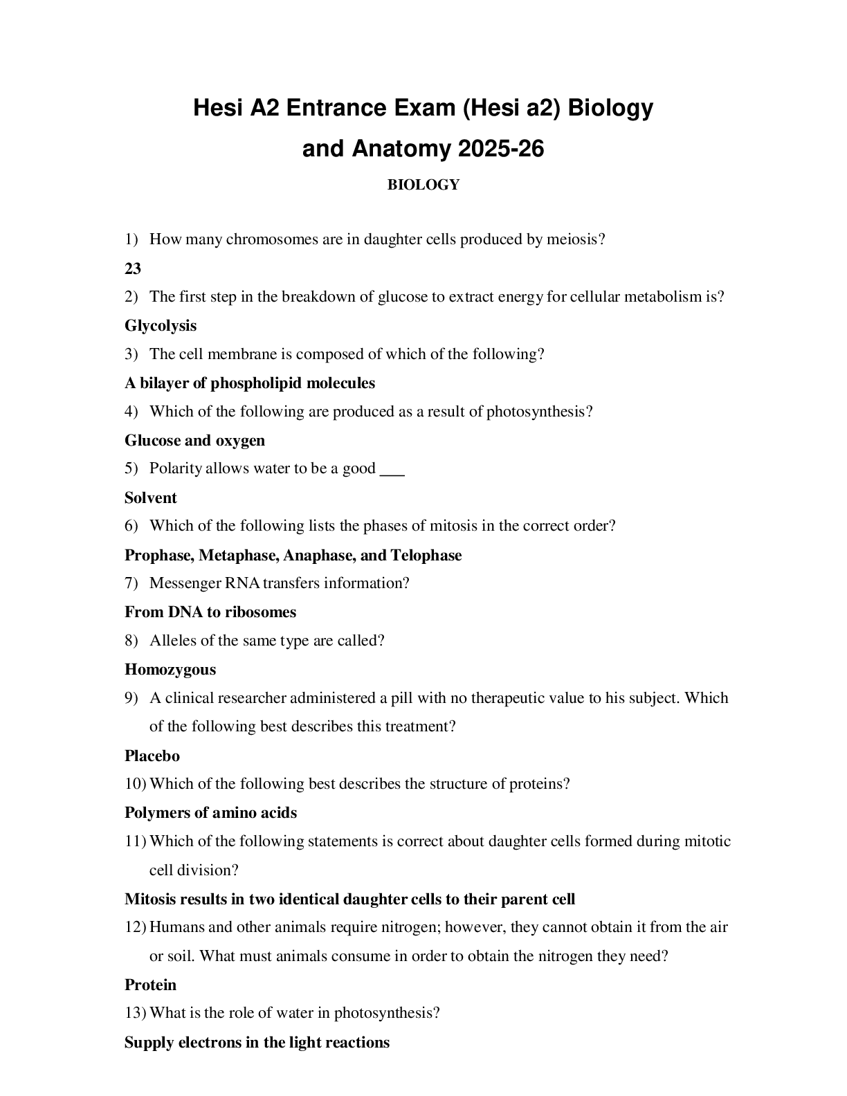 Hesi A2 Entrance Exam (Hesi a2) Biology and Anatomy 2025-26 l BIOLOGY