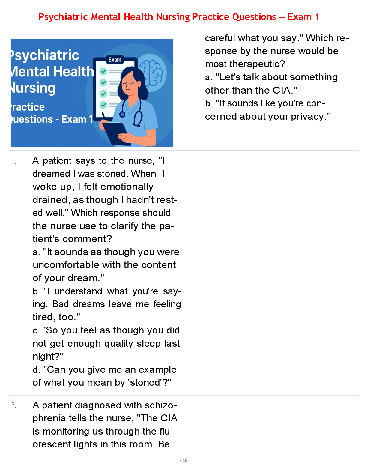 Prepare for success with our Psychiatric and Mental Health Nursing Exam 1 practice questions designed to strengthen your knowledge and boost test confidence. This comprehensive nursing practice test c...