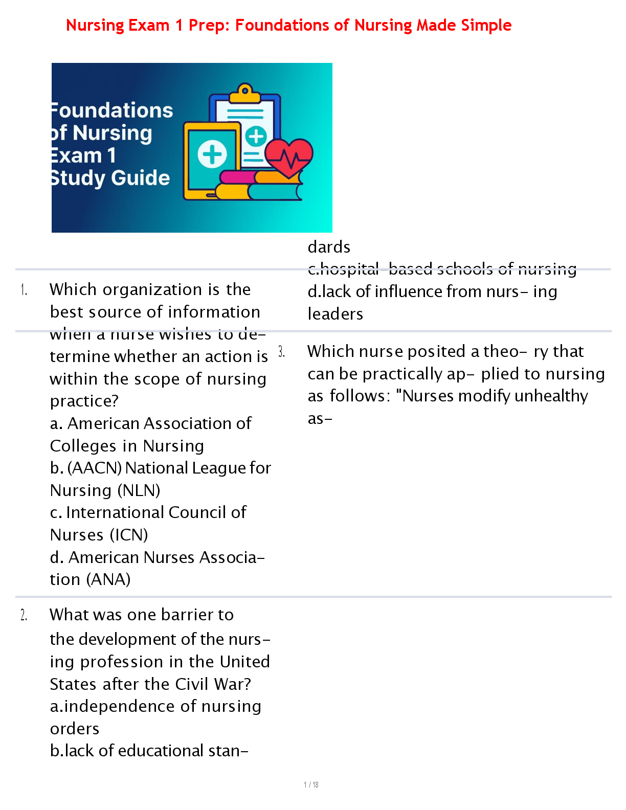 Prepare for success with this Foundations of Nursing Exam 1 study guide. Review key nursing concepts, practice questions, and test prep strategies designed to help nursing students build confidence an...