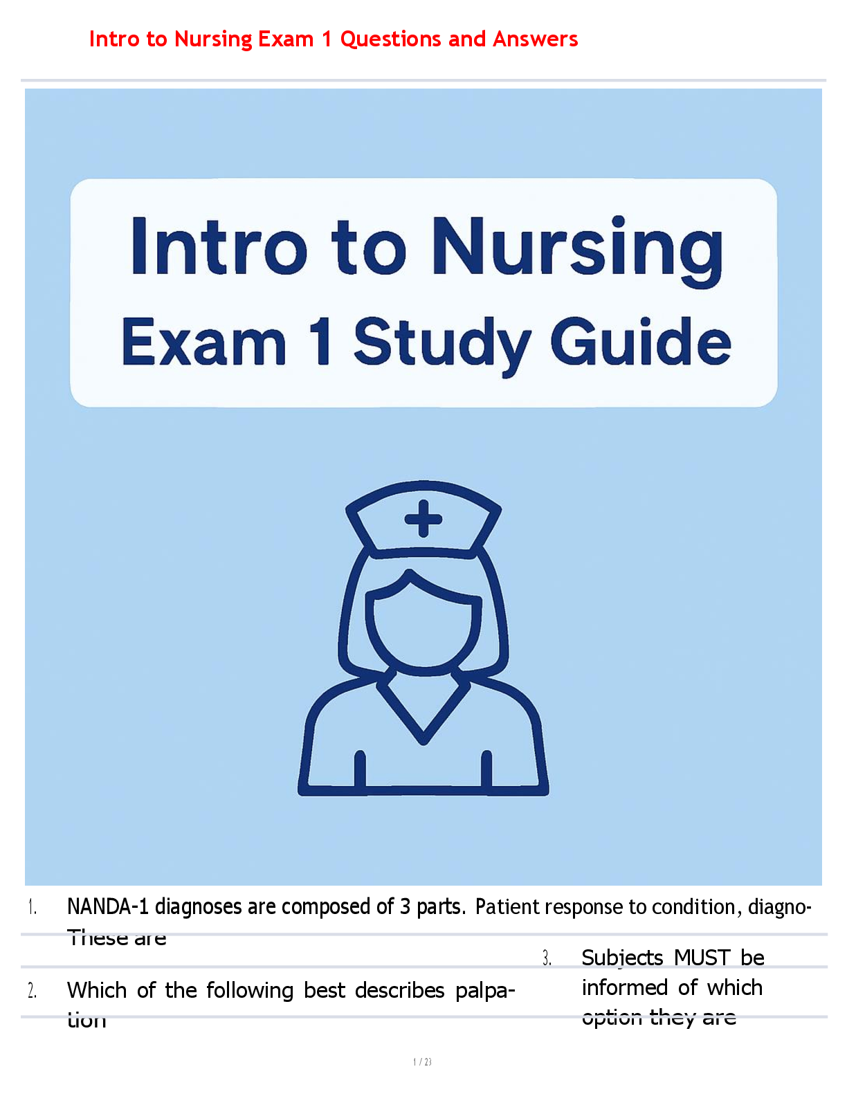 Prepare for success with this Intro to Nursing Exam 1 study guide designed to help nursing students review key concepts, practice exam questions, and build confidence. Covering the fundamentals of nur...