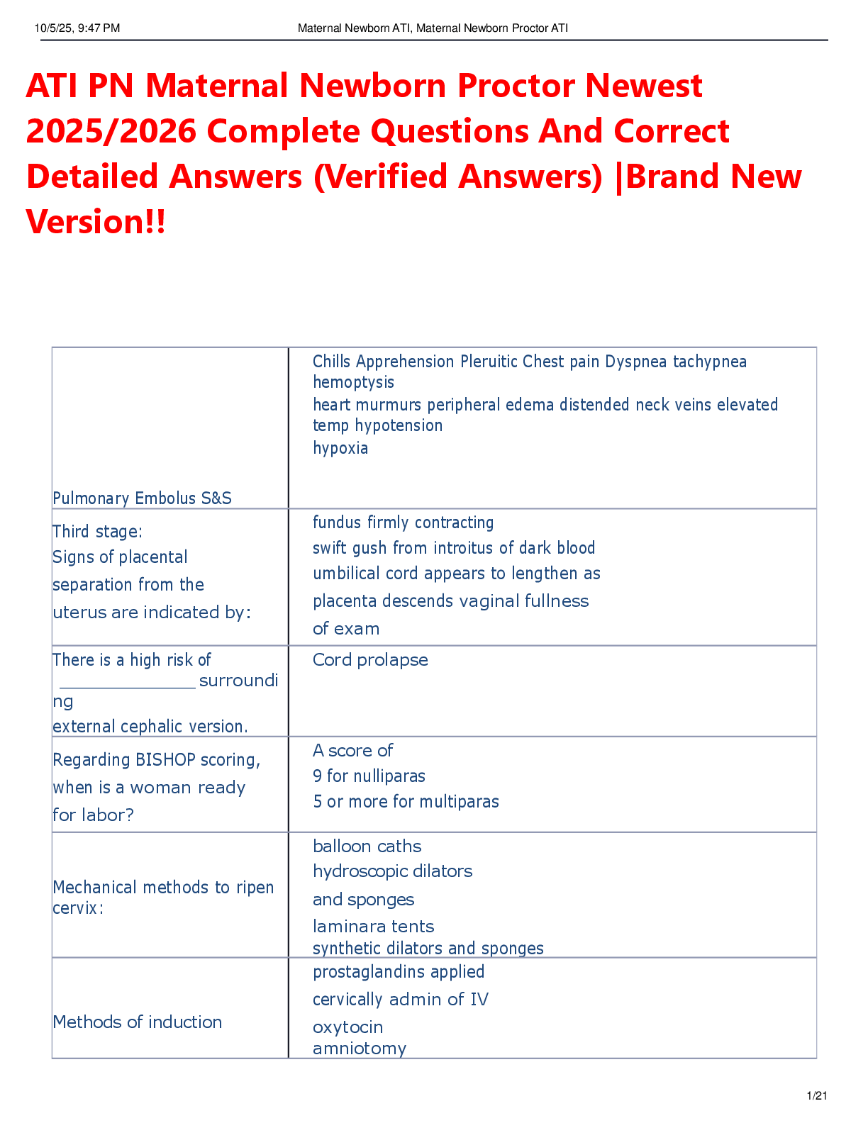 ATI PN Maternal Newborn Proctor Newest 2025/2026 Complete Questions And Correct Detailed Answers (Verified Answers) |Brand New Version!!ATI PN Maternal Newborn Proctor Newest 2025/2026 Complete Questi... ons And Correct Detailed Answers (Verified Answers) |Brand New Version!!ATI PN Maternal Newborn Proctor Newest 2025/2026 Complete Questions And Correct Detailed Answers (Verified Answers) |Brand New Version!! ATI PN Maternal Newborn Proctor Newest 2025/2026 Complete Questions And Correct Detailed Answers (Verified Answers) |Brand New Version!! ATI PN Maternal Newborn Proctor Newest 2025/2026 Complete Questions And Correct Detailed Answers (Verified Answers) |Brand New Version!! ATI PN Maternal Newborn Proctor Newest 2025/2026 Complete Questions And Correct Detailed Answers (Verified Answers) |Brand New Version!! [Show More]