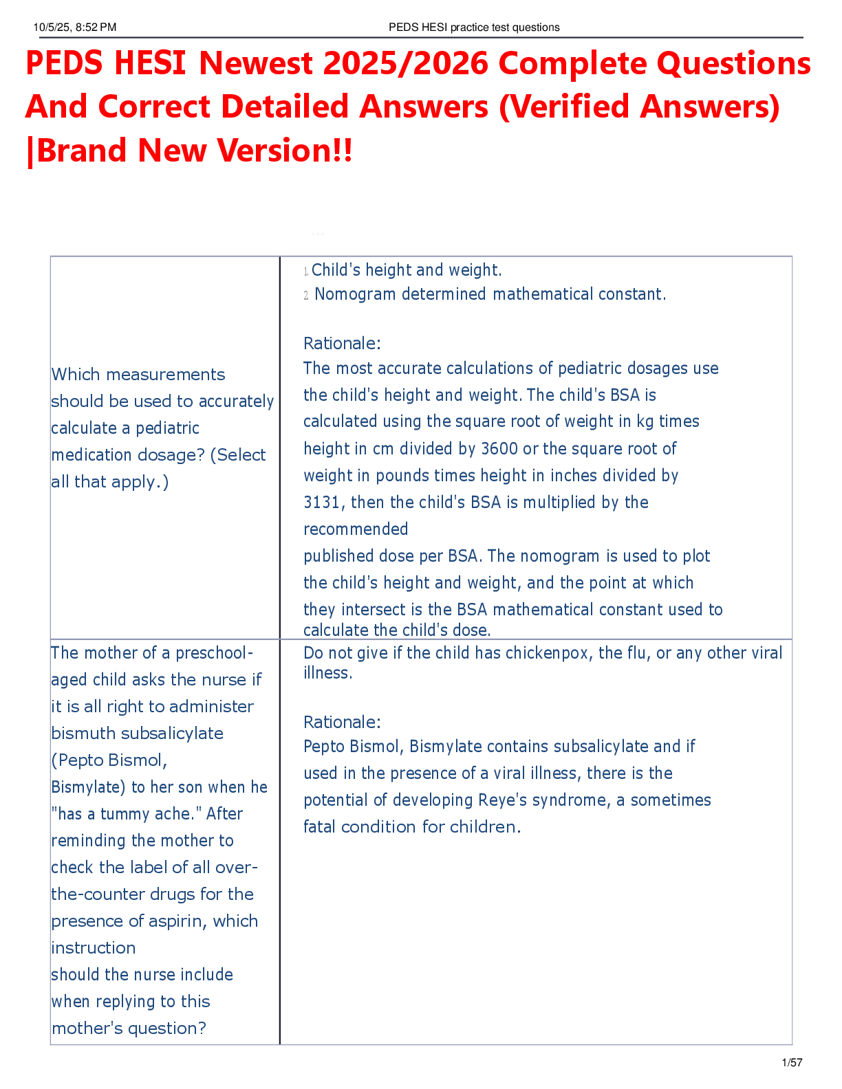 PEDS HESI Newest 2025/2026 Complete Questions And Correct Detailed Answers (Verified Answers) |Brand New Version!PEDS HESI Newest 2025/2026 Complete Questions And Correct Detailed Answers (Verified...