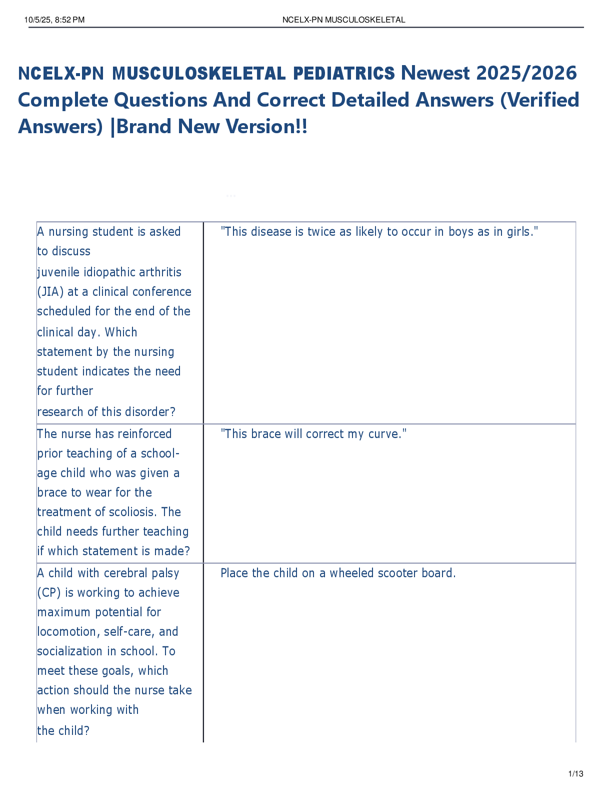 NCELX-PN MUSCULOSKELETAL PEDIATRICS Newest 2025/2026 Complete Questions And Correct Detailed Answers (Verified Answers) |Brand New Version!NCELX-PN MUSCULOSKELETAL PEDIATRICS Newest 2025/2026 Compl...