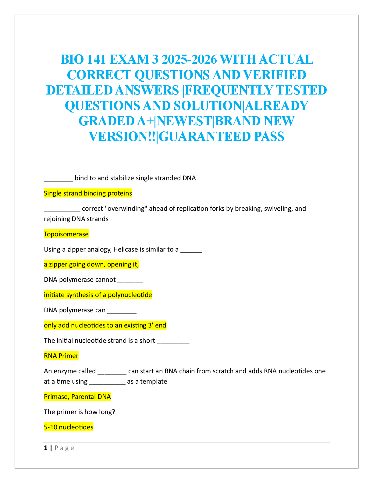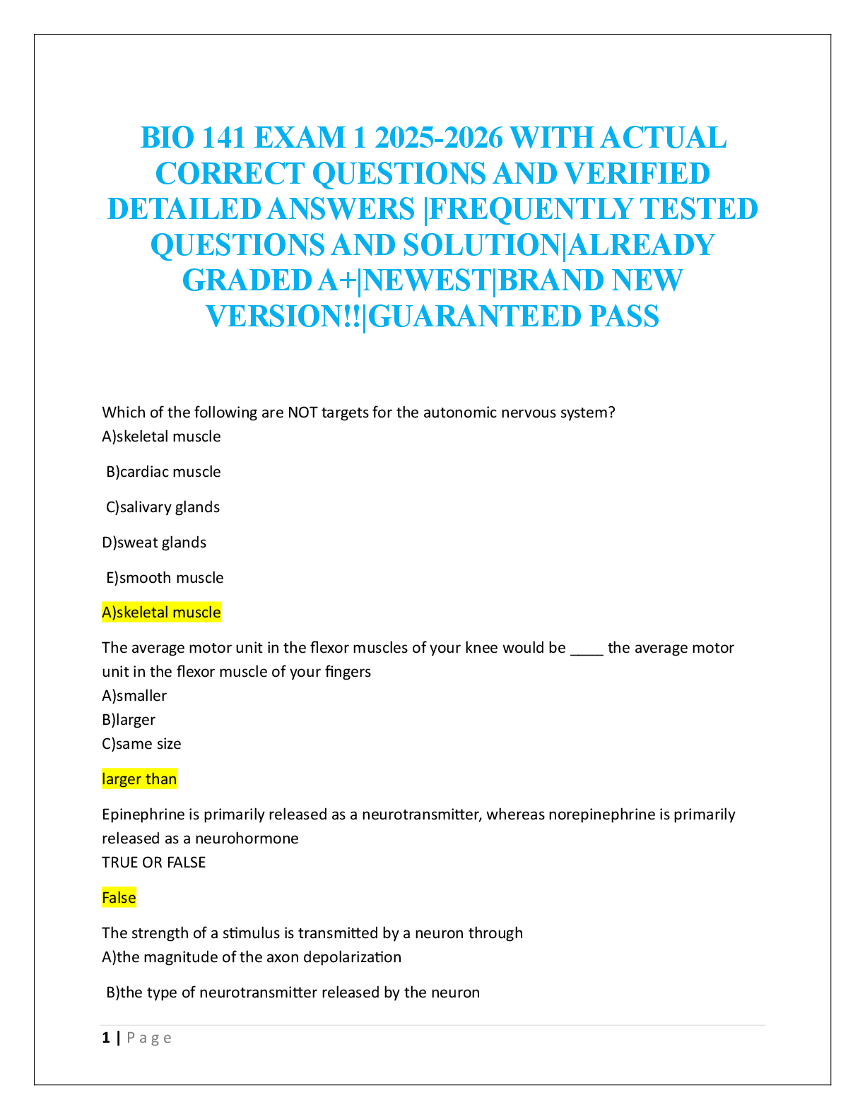 BIO 141 EXAM 1,2,3 AND FINAL 2025-2026 WITH ACTUAL CORRECT QUESTIONS AND VERIFIED DETAILED ANSWERS |FREQUENTLY TESTED QUESTIONS AND SOLUTION|ALREADY GRADED A+|NEWEST|BRAND NEW VERSION!!|GUA... RANTEED PASS [Show More]