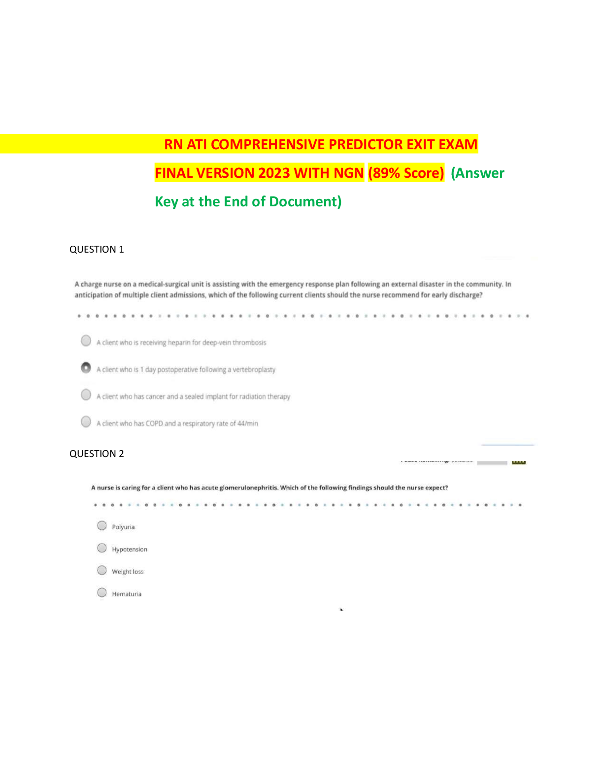 RN ATI COMPREHENSIVE PREDICTOR EXIT EXAM 2023 WITH NGN COMPILATION OF 3-VERSIONS.
