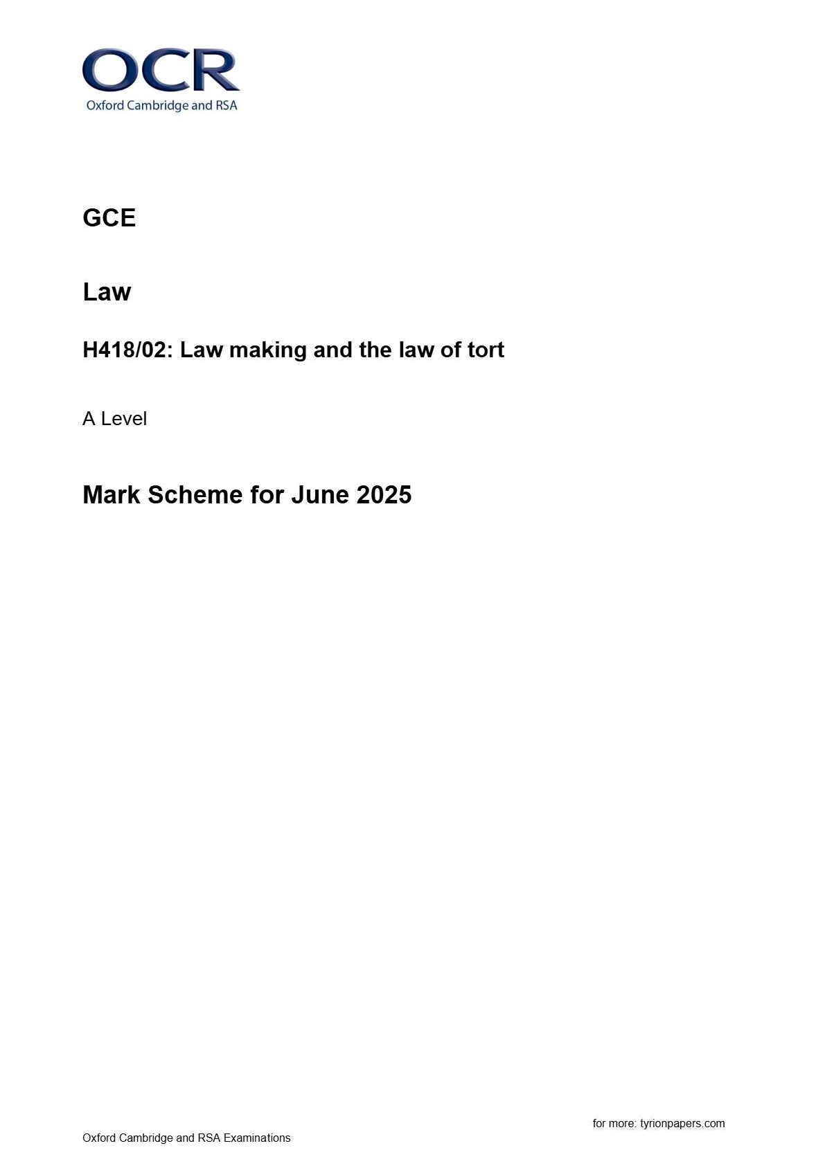 OCR GCE Law H418/02: Law making and the law of tort A Level Mark Scheme for June 2025