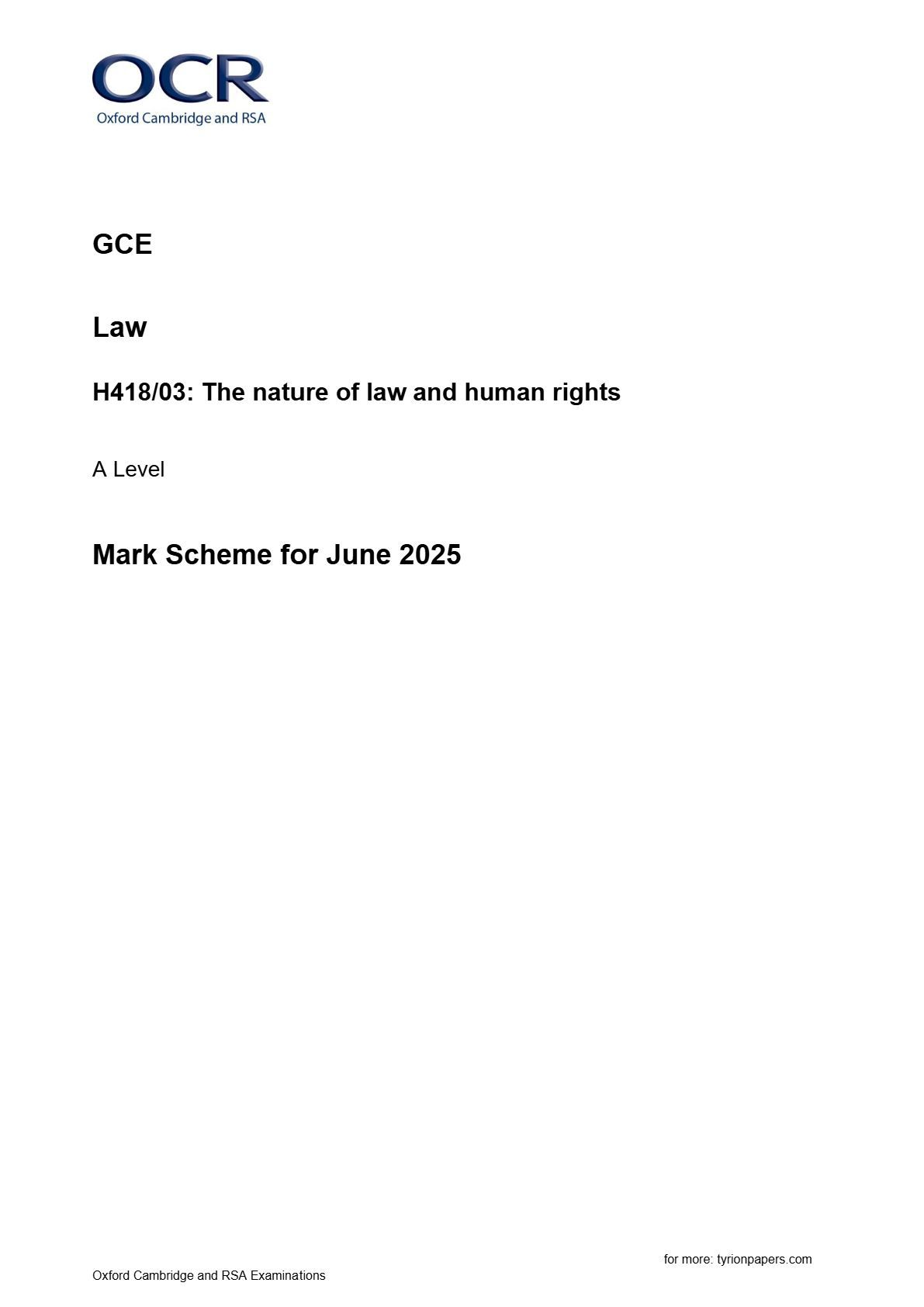 Law> A-Level Mark Scheme > OCR GCE Law H418/03: The nature of law and human rights A Level Mark Scheme for June 2025 (All)