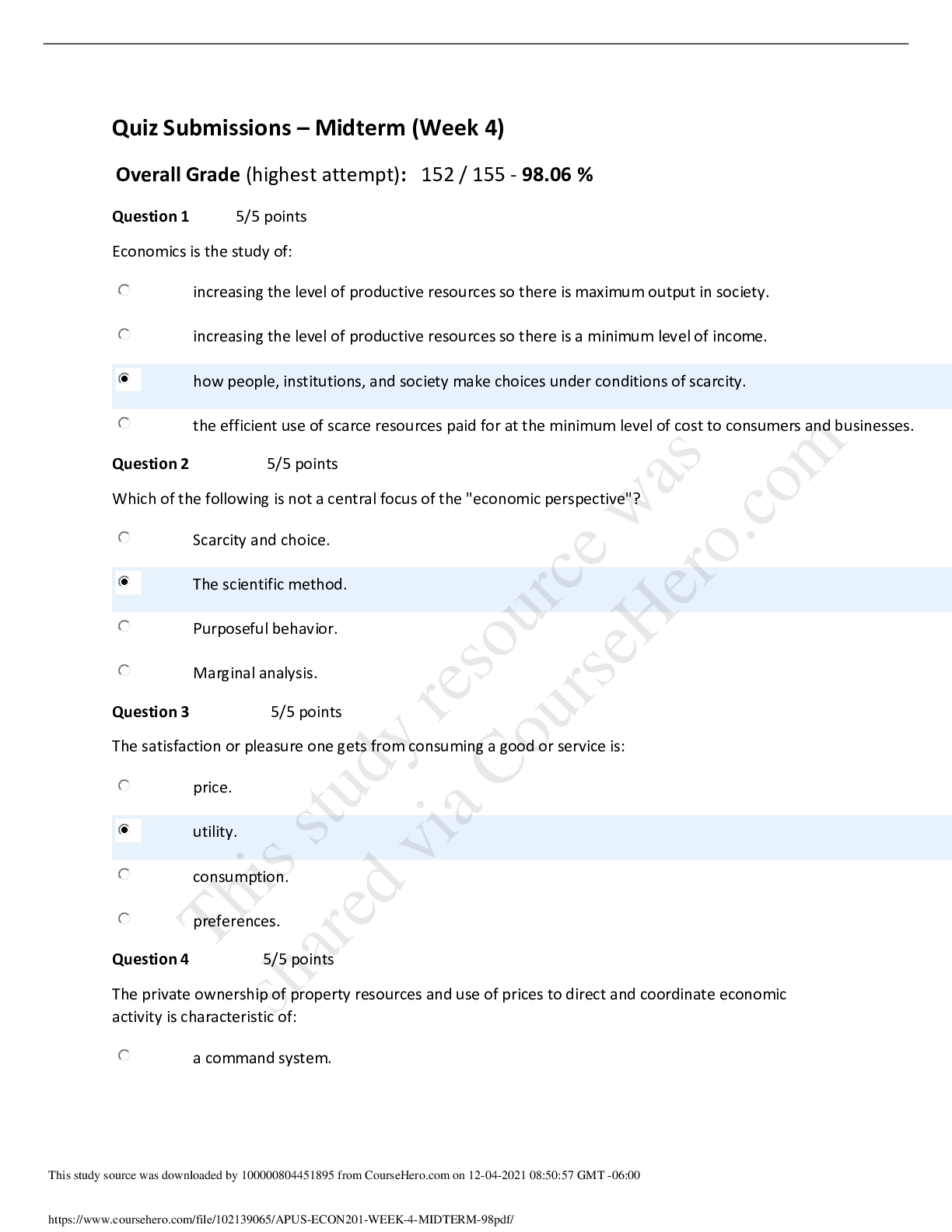 ECON 201APUS_ECON201_WEEK_4_MIDTERM GRADED 98% (Latest 2021/2022) Economics is the study of: increasing the level of productive resources so there is maximum output in society. increasing the level...