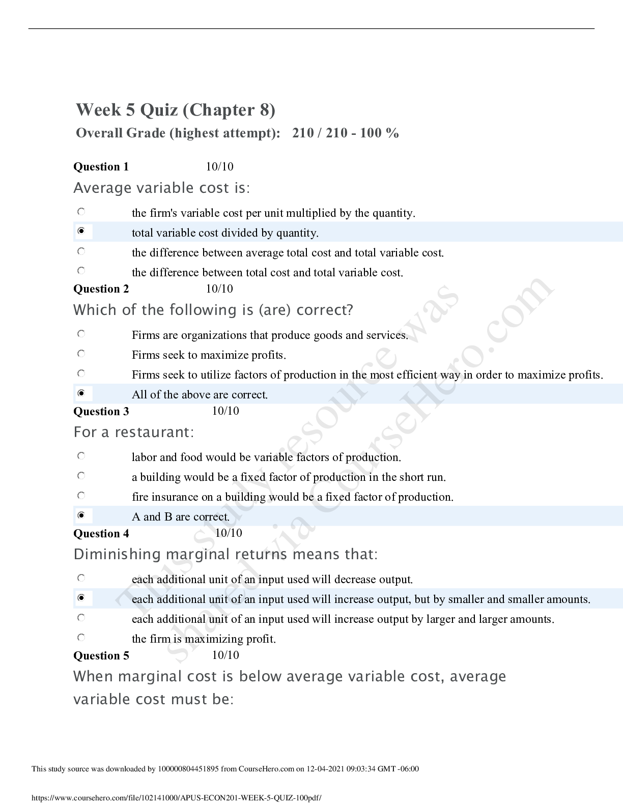 ECON 201APUS_ECON201_WEEK_5_QUIZ GRADED 100% (Latest 2021/2022)