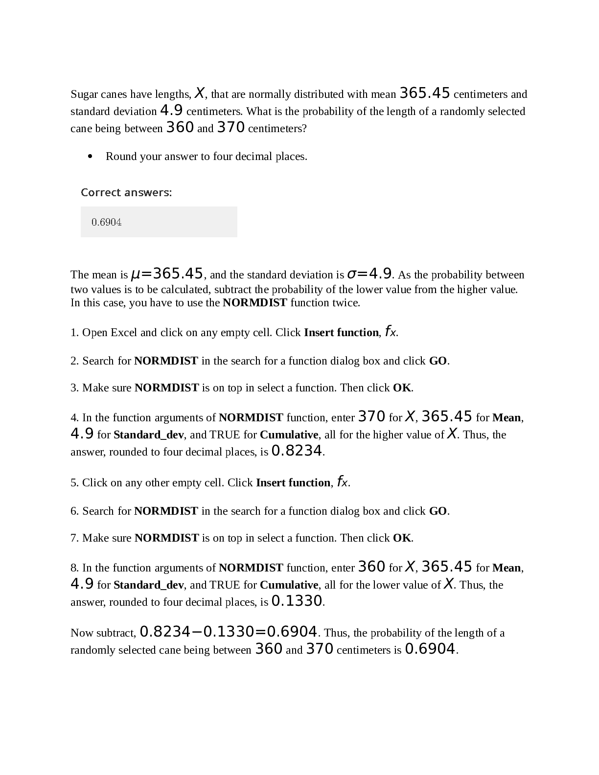 Sugar canes have lengths, X, that are normally distributed with mean 365.45 centimeters and standard deviation 4.9 centimeters. What is the probability of the length of a randomly selected cane bein... g between 360 and 370 centimeters? Round your answer to four decimal places. The mean is μ=365.45, and the standard deviation is σ=4.9. As the probability between two values is to be calculated, subtract the probability of the lower value from the higher value. In this case, you have to use the NORMDIST function twice. 1. Open Excel and click on any empty cell. Click Insert function, fx. 2. Search for NORMDIST in the search for a function dialog box and click GO. 3. Make sure NORMDIST is on top in select a function. Then click OK. 4. In the function arguments of NORMDIST function, enter 370 for X, 365.45 for Mean, 4.9 for Standard_dev, and TRUE for Cumulative, all for the higher value of X. Thus, the answer, rounded to four decimal places, is 0.8234. 5. Click on any other empty cell. Click Insert function, fx. 6. Search for NORMDIST in the search for a function dialog box and click GO. 7. Make sure NORMDIST is on top in select a function. Then click OK. 8. In the function arguments of NORMDIST function, enter 360 for X, 365.45 for Mean, 4.9 for Standard_dev, and TRUE for Cumulative, all for the lower value of X. Thus, the answer, rounded to four decimal places, is 0.1330. Now subtract, 0.8234−0.1330=0.6904. Thus, the probability of the length of a randomly selected cane being between 360 and 370 centimeters is 0.6904. Suppose that the weight of navel oranges is normally distributed with a mean of μ=6 ounces and a standard deviation of σ=0.8 ounces. Find the weight below that one can find the lightest 90% of all navel oranges. Use Excel, and round your answer to two decimal places. The weights of bags of raisins are normally distributed with a mean of 175 grams and a standard deviation of 11 grams. Bags in the upper 4.5% are too heavy and must be repackaged. Also, bags in the lower 5% do not meet the minimum weight requirement and must be repackaged. What are the ranges of weights for raisin bags that need to be repackaged? Use Excel, and round your answers to the nearest integer. The time, X minutes, taken by Tim to install a satellite dish is assumed to be a normal random variable with mean 127 and standard deviation 20. Determine the probability that Tim will takes less than 150 minutes to install a satellite dish. Round your answer to four decimal places. The average speed of a car on the highway is 85 kmph with a standard deviation of 5 kmph. Assume the speed of the car, X, is normally distributed. Find the probability that the speed is less than 80 kmph. Round your answer to four decimal places. Use the normal distribution to compute probability with technology - Excel Use the Normal Distribution to Compute Probability Using Excel Use the Normal Distribution to Compute Probability Using Excel A normal distribution curve is a symmetric bell-shaped curve, continuous for all the values of X between −∞ and ∞. The parameter μ is the mean of the normal distribution, and σ is its standard deviation. The graph of a normal distribution is called the normal curve. A normal curve with mean μ and standard deviation σ is shown below. [Show More]