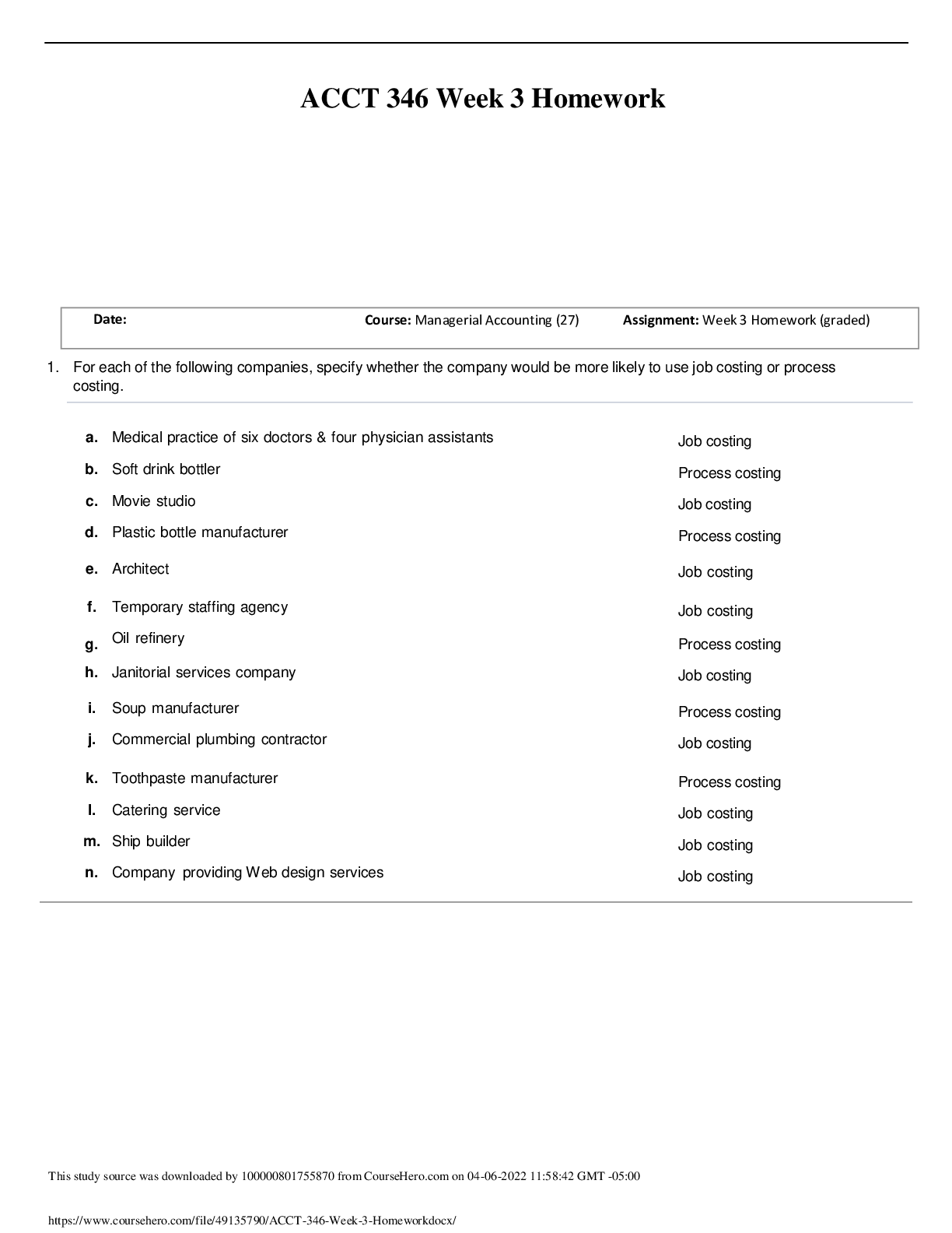 ACCT 346 Week 3 Homework 1. For each of the following companies, specify whether the company would be more likely to use job costing or process costing. a. Medical practice...