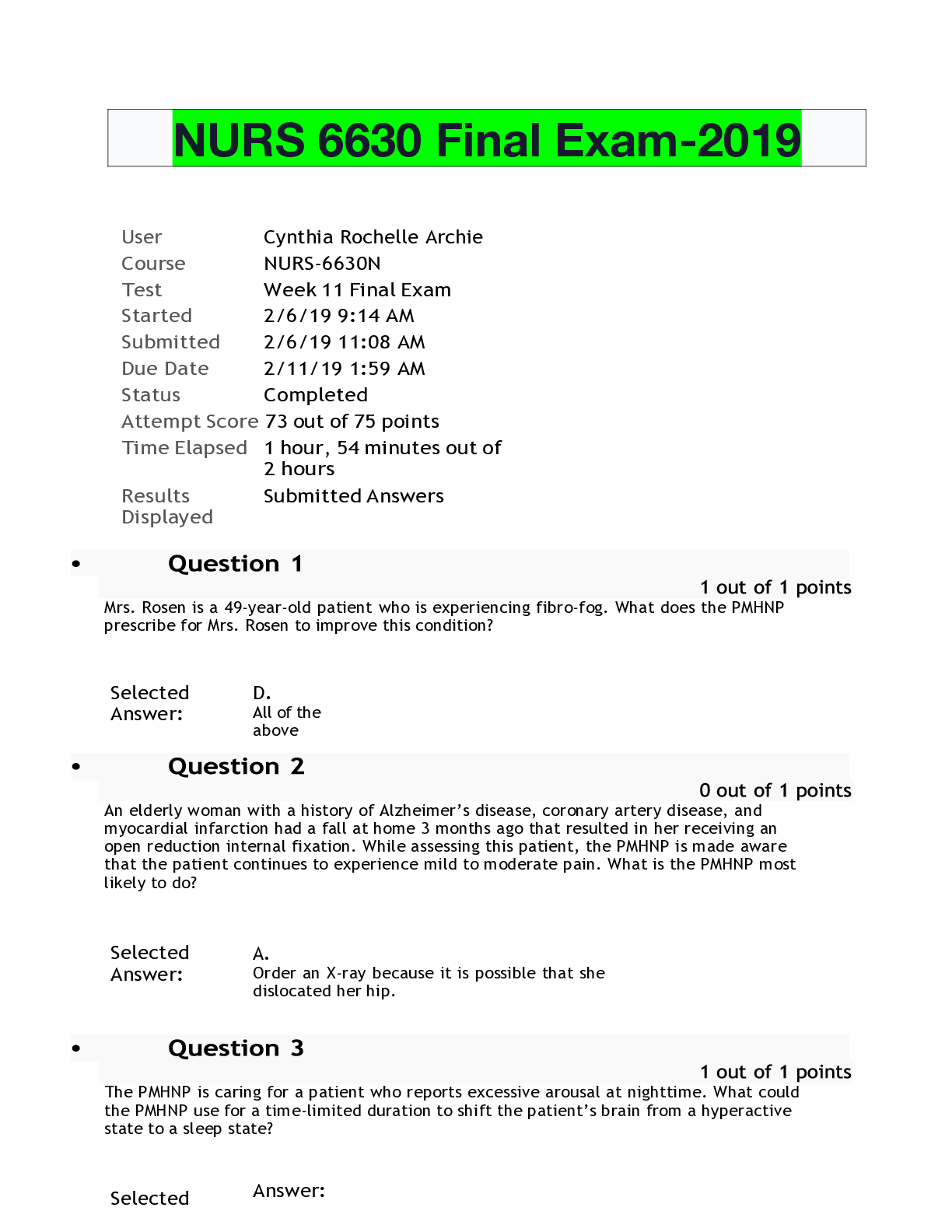 NURS 6630 Final Exam-2019- 76 Q&A 1. Mrs. Rosen is a 49-year-old patient who is experiencing fibro-fog. What does the PMHNP prescribe for Mrs. Rosen to improve this condition? 2. An elderl...