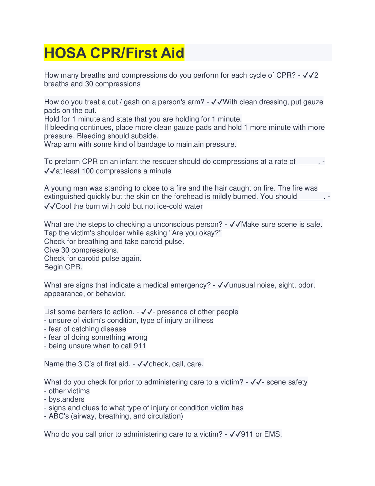 Health Care> EXAM > HOSA CPR/First Aid | 192 Questions with 100% Correct Answers (All)