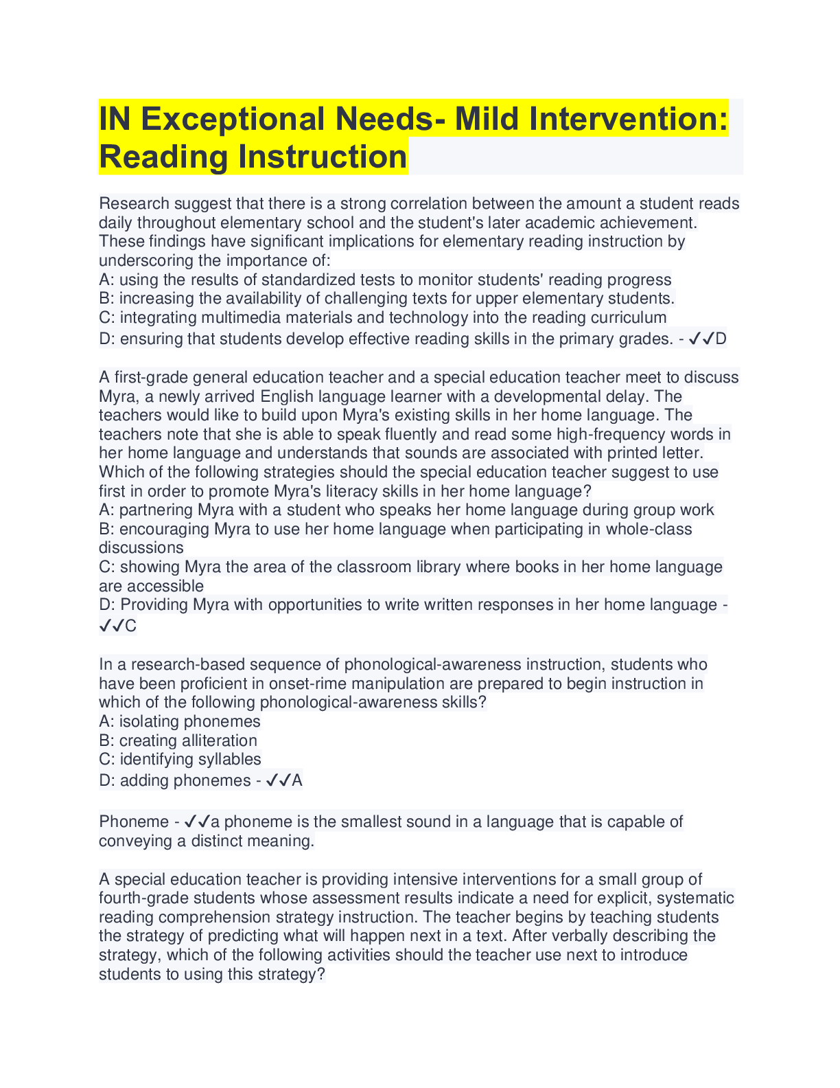 Psychology> EXAM > IN Exceptional Needs- Mild Intervention: Reading Instruction | 100% Correct Answers (All)
