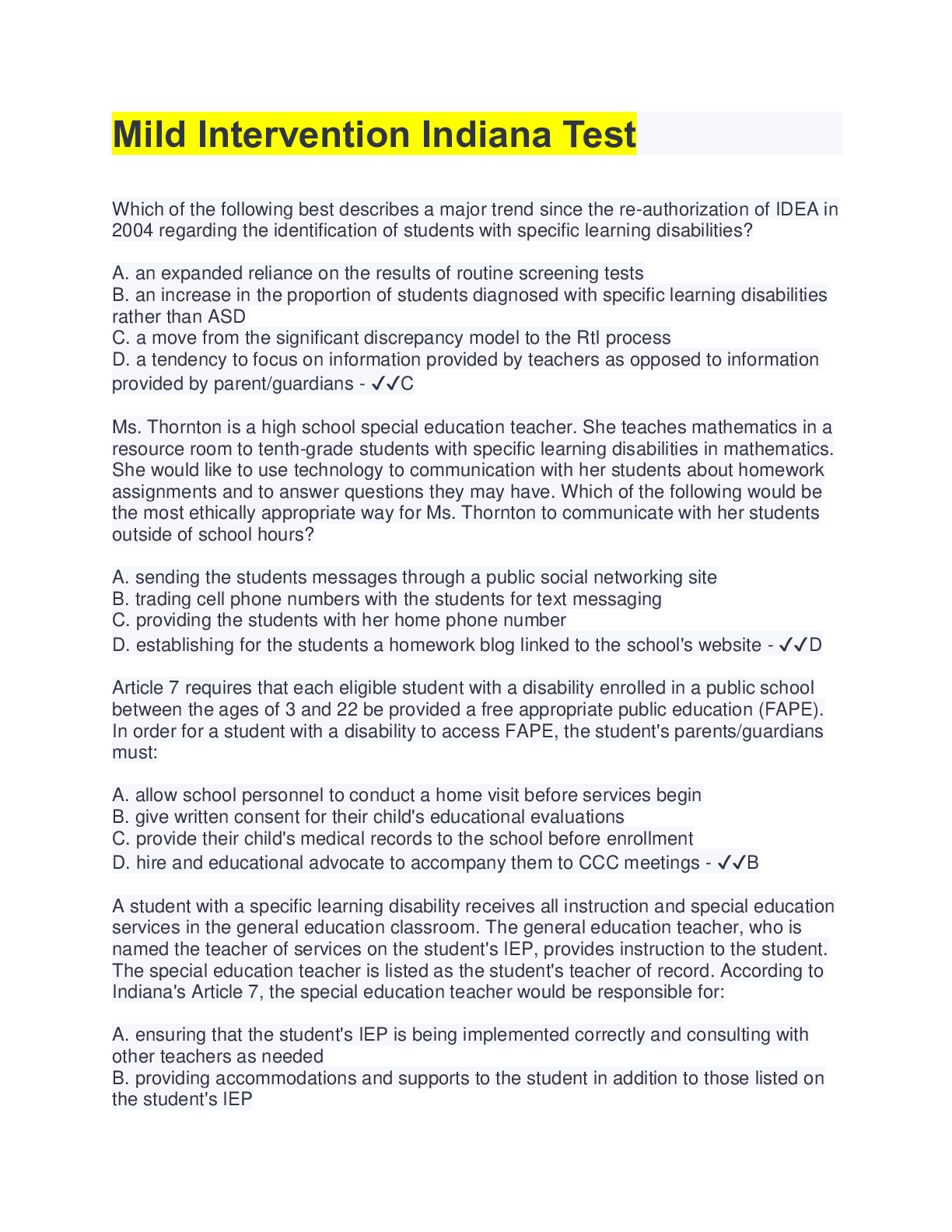 Health Care> EXAM > Indiana (025) Mild Interventions | 55 Questions with 100% Correct Answers (All)