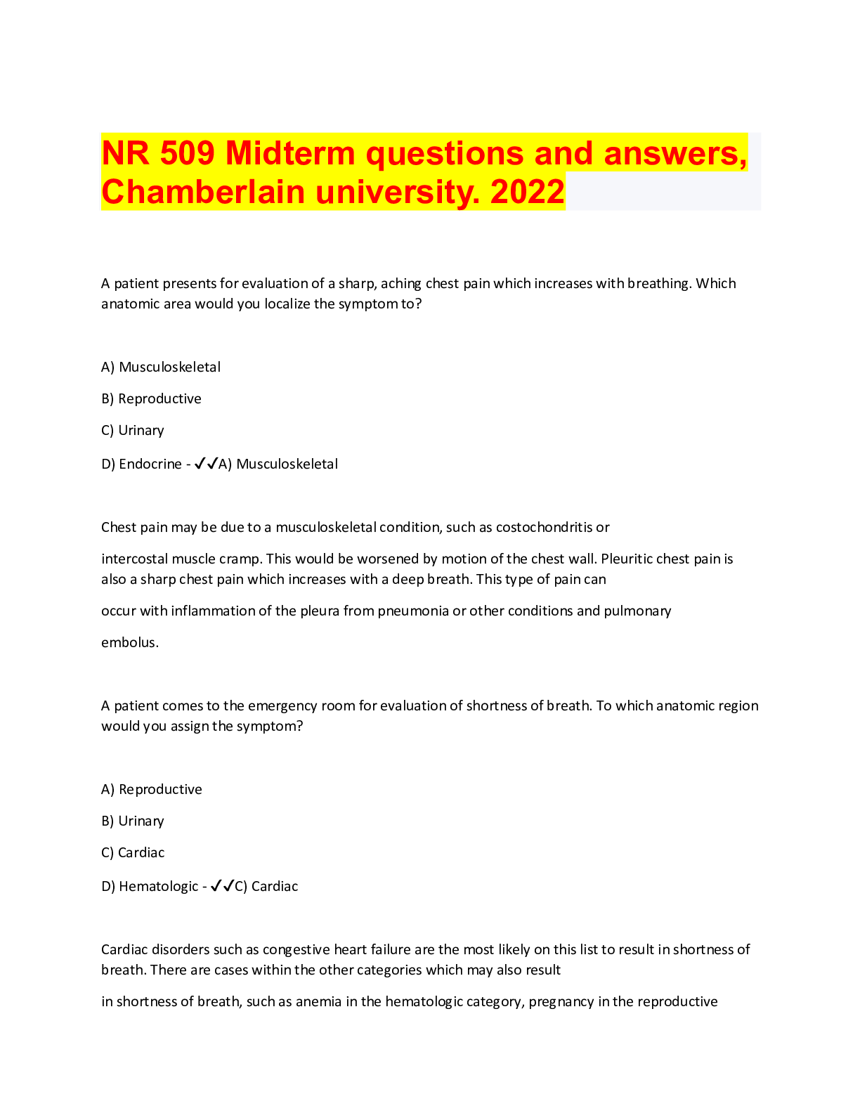 NR 509 Midterm questions and answers, Chamberlain university. 2022 A patient presents for evaluation of a sharp, aching chest pain which increases with breathing. Which anatomic area would you lo...