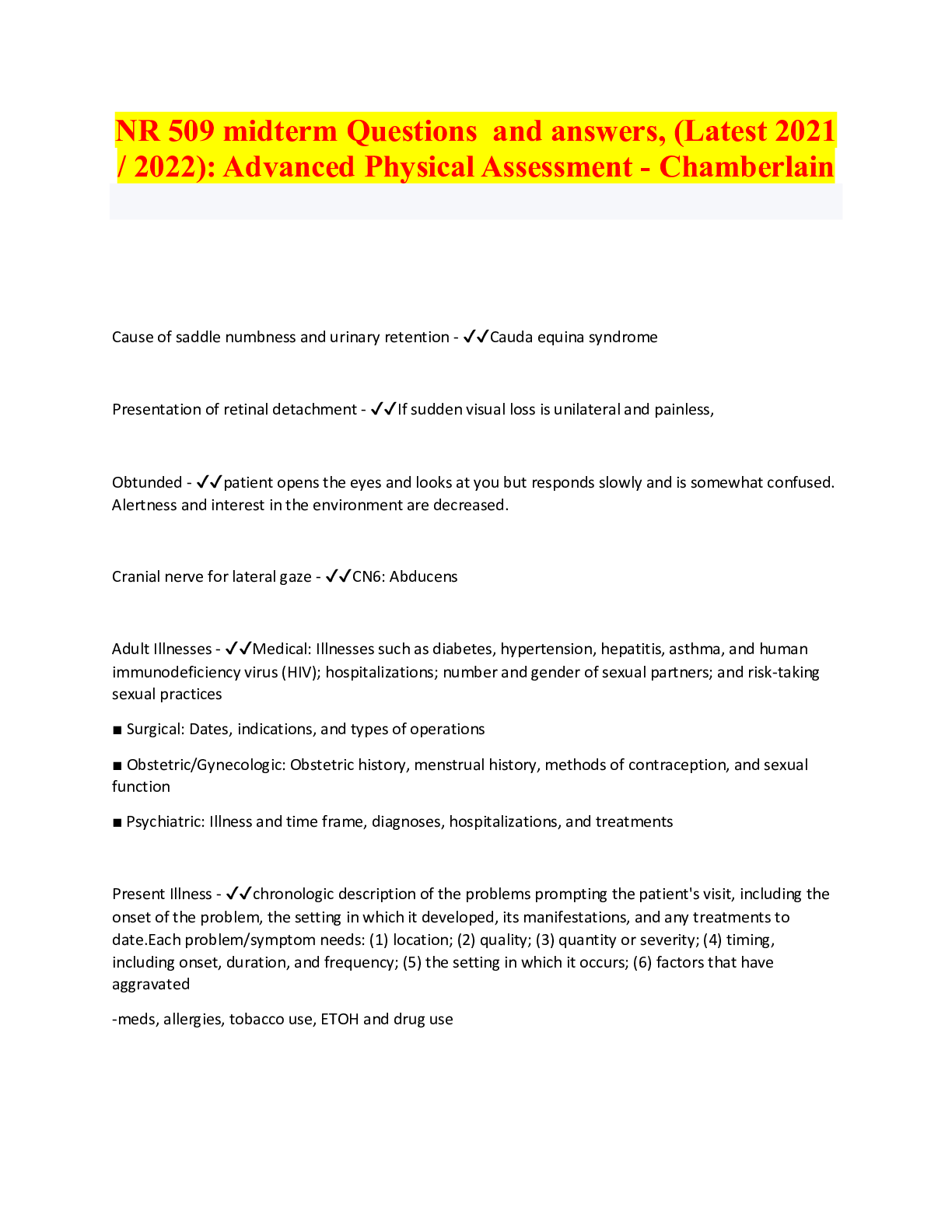 NR 509 midterm Questions and answers, (Latest 2021 / 2022): Advanced Physical Assessment - Chamberlain Cause of saddle numbness and urinary retention - ✔✔Cauda equina syndrome Presentatio...