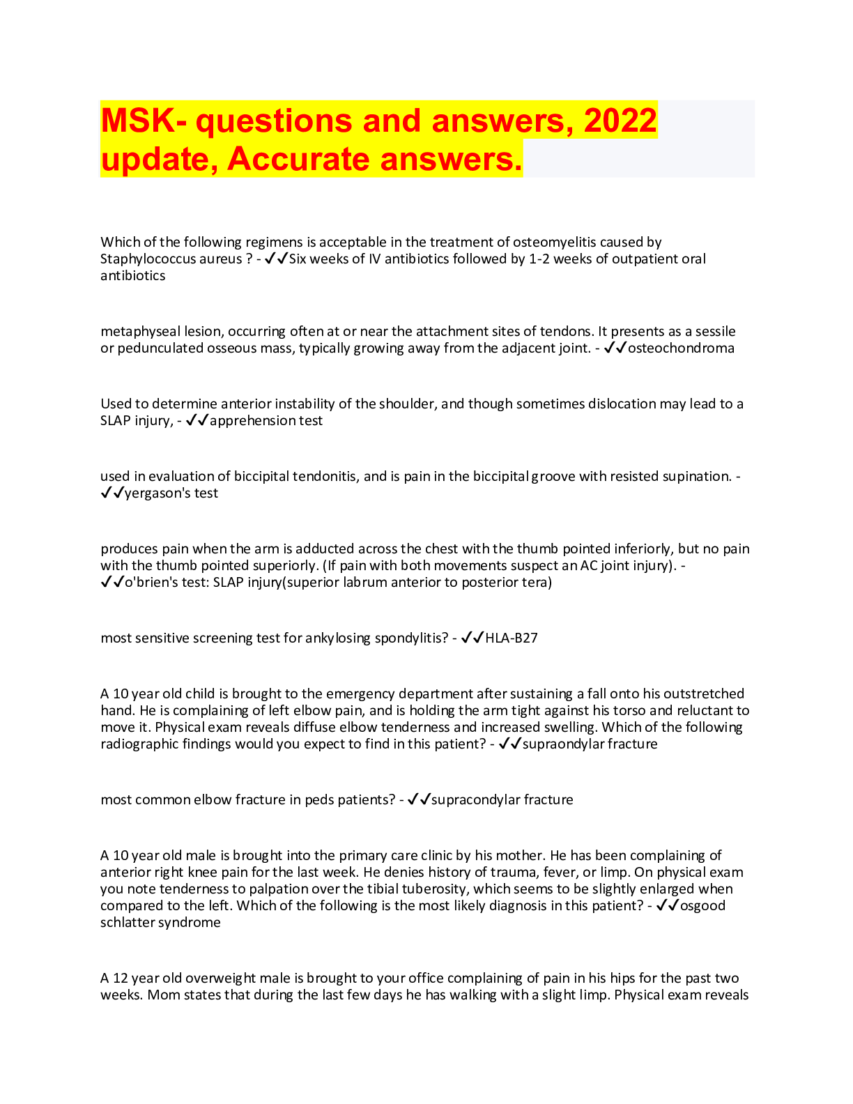 *NURSING> QUESTIONS & ANSWERS > MSK- questions and answers, 2022 update, Accurate answers. (All)