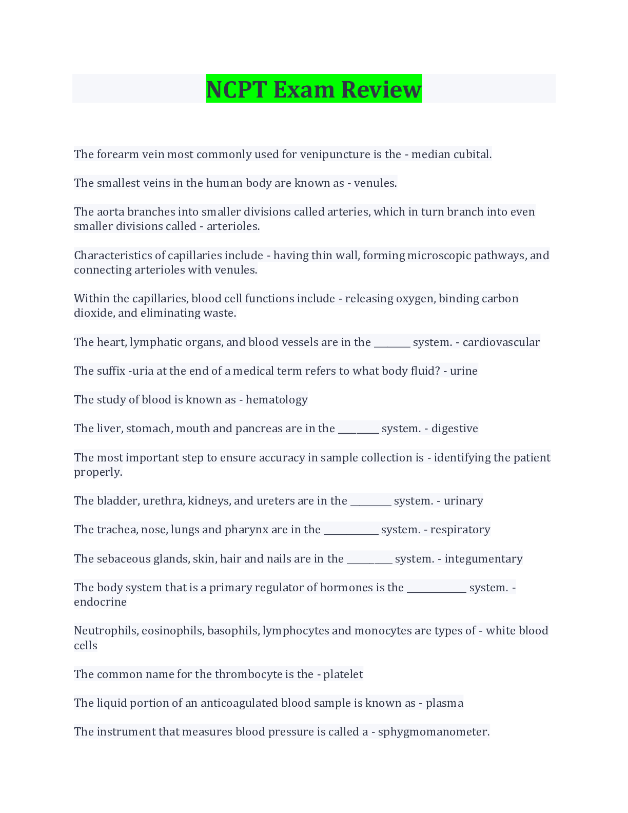 Health Care> EXAM > Phlebotomy National Exam Study Guide Terms And Explanations With Complete Top Solution. Download (All)