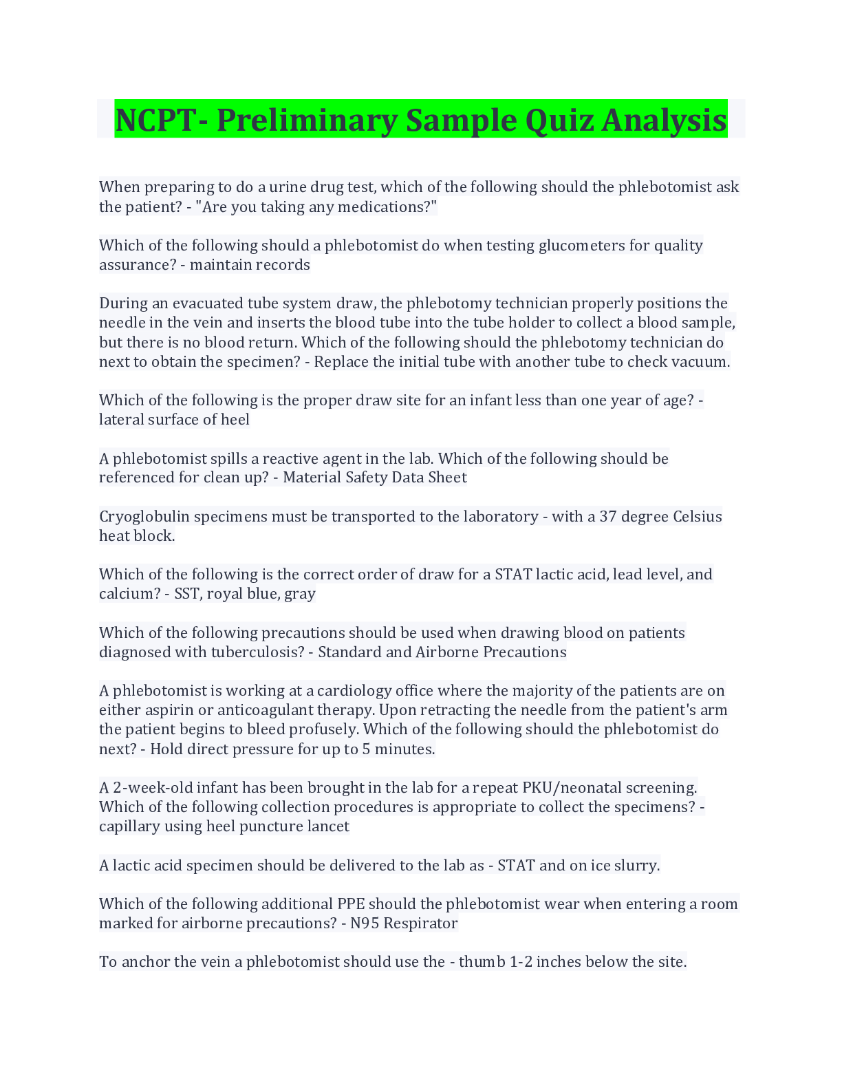 Health Care> EXAM > NCPT- Preliminary Sample Quiz Analysis; Latest Update 2022 (All)