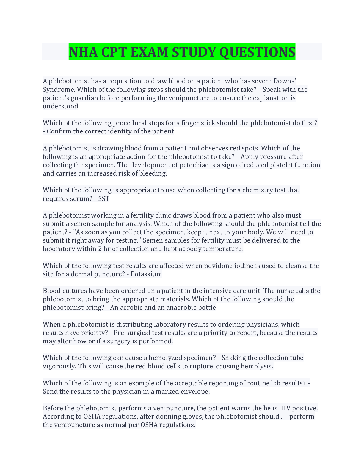 Health Care> EXAM > NHA CPT EXAM STUDY QUESTIONS AND ANSWERS WITH COMPLETE TOP SOLUTION RATED A. (All)