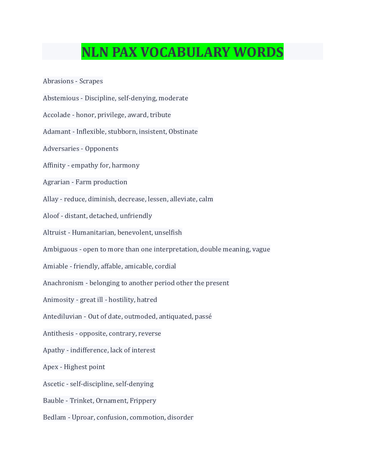 English> EXAM > NLN PAX VOCABULARY WORDS TERMS AND EXPLANATIONS( LATEST UPDATE) WITH COMPLETE TOP SOLUTION. (All)