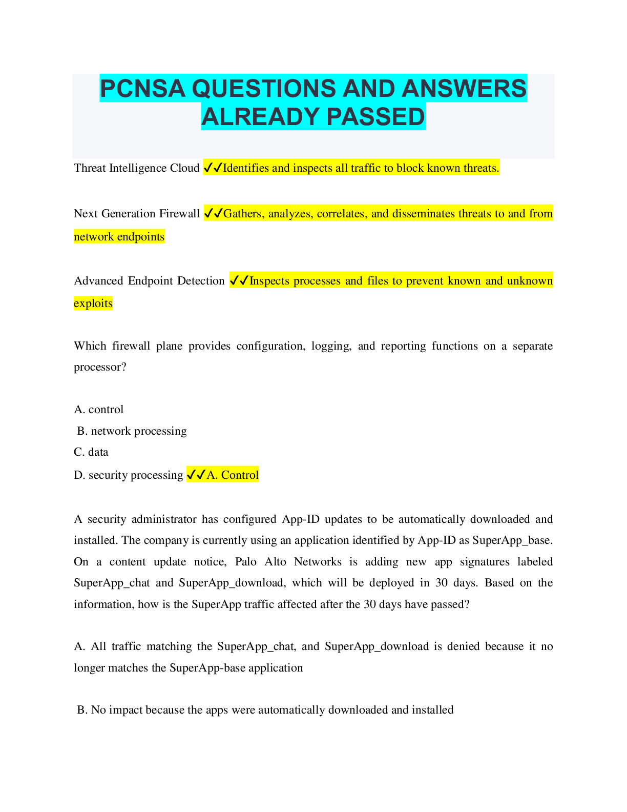 PCNSA QUESTIONS AND ANSWERS ALREADY PASSED Threat Intelligence Cloud ✔✔Identifies and inspects all traffic to block known threats. Next Generation Firewall ✔✔Gathers, analyzes, correlates, and diss...
