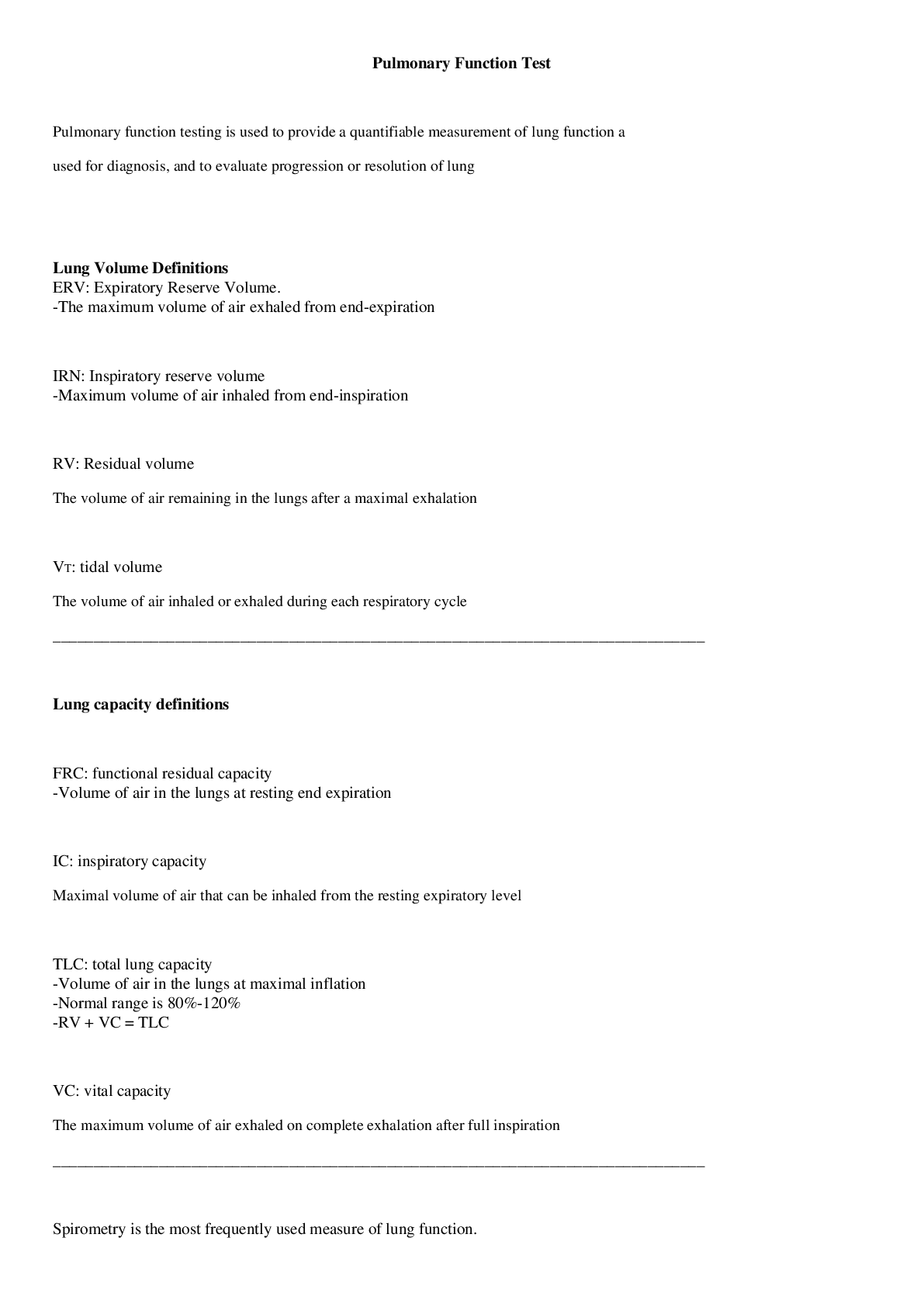 NR 601 Week 1 Pulmonary Function Testing Definitions Definition Lung Volume definitions Lung Capacity definitions Spirometry measures Interpretation Step 1: Spi...