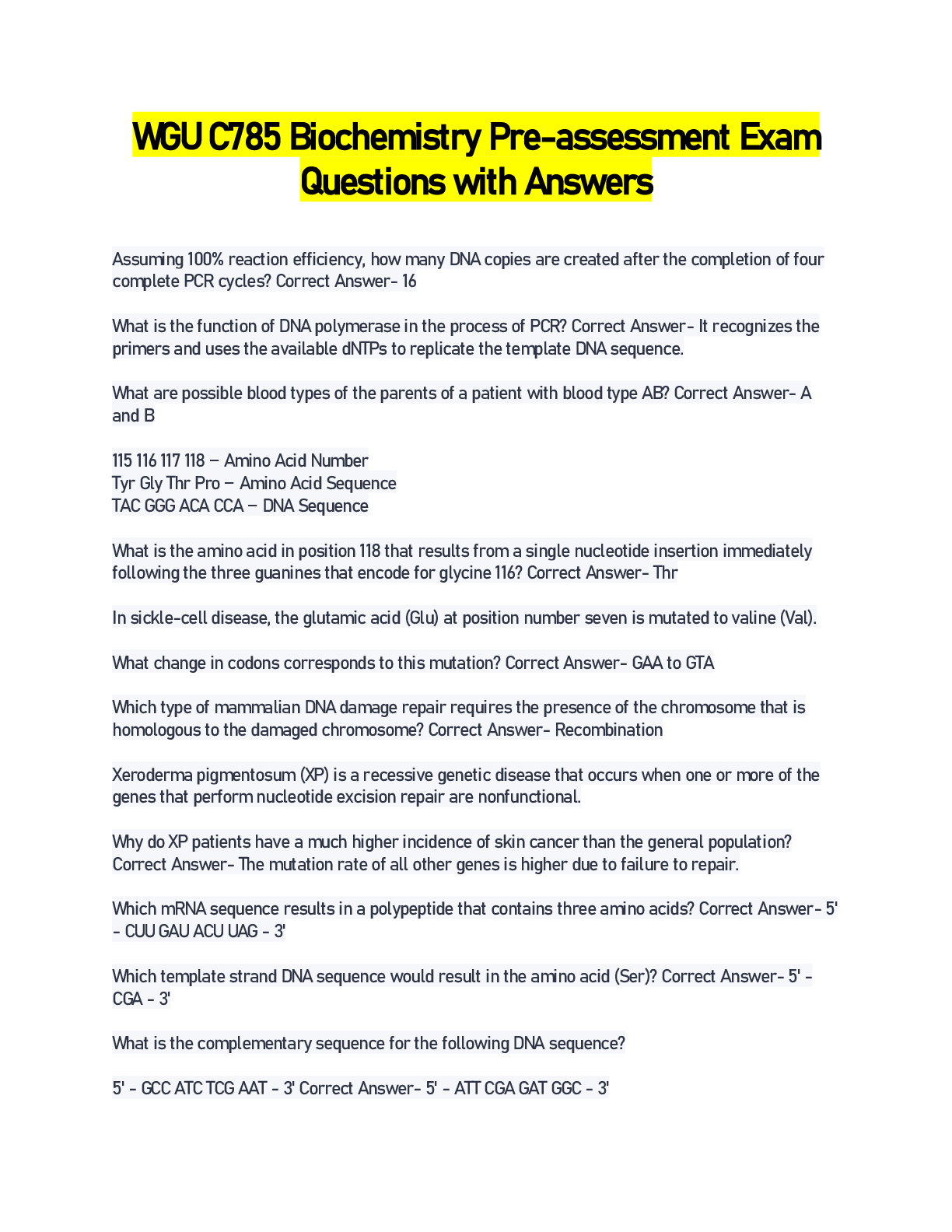 WGU C785 Biochemistry Pre-assessment Exam Questions with Answers Assuming 100% reaction efficiency, how many DNA copies are created after the completion of four complete PCR cycles? Correct Answer- 1...