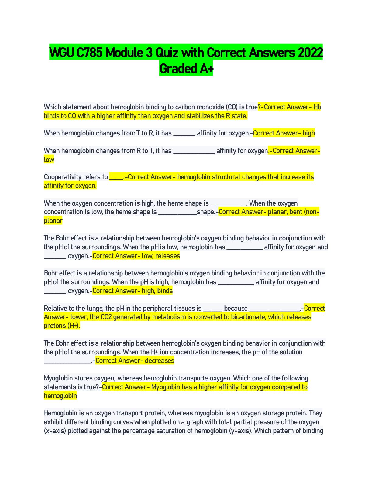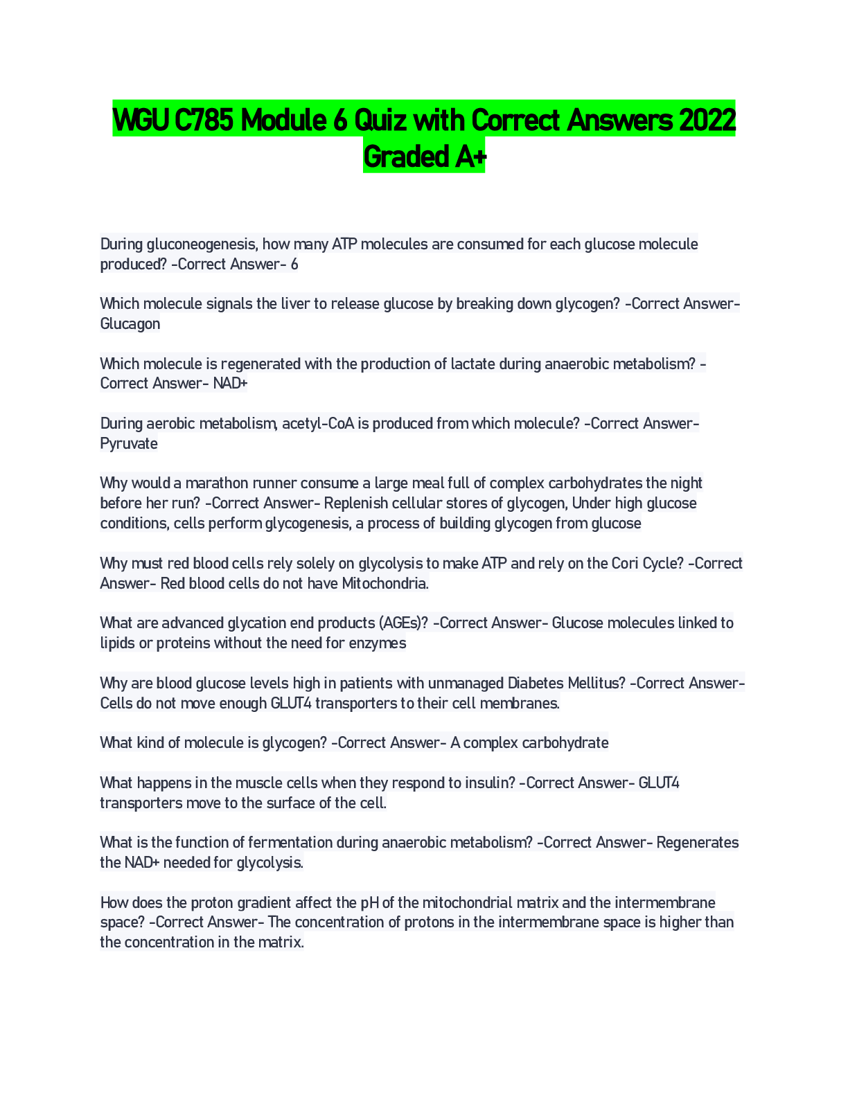 WGU C785 Protein Folding Exam Questions with Answers WGU C785 Module 2 Quiz and Study Guide with Correct Answers 2022 Graded A+ WGU C785 Module 6 Quiz with Correct Answers 2022 Graded A+ WGU ... C785 Module 5 Quiz with Correct Answers 2022 Graded A+ WGU C785 Module 3 Quiz with Correct Answers 2022 Graded A+ WGU C785 Module 4 Quiz with Correct Answers 2022 Graded A+ WGU C785 Biochemistry Final Exam 2022/2023 Graded A+ WGU Biochemistry C785 Exam Questions with Answers 2022 WGU C785 Biochemistry Final Exam(70 QnS) 2022/2023 WGU C785 Readiness Exam WGU C785 Biochemistry Pre-assessment Exam Questions with Answers WGU C785 Biochemistry Final Exam Questions and Answers 2022/2023 WGU C785 Glucose Regulation Questions and Answers WGU C785 Glucose Regulation Questions and Answers [Show More]