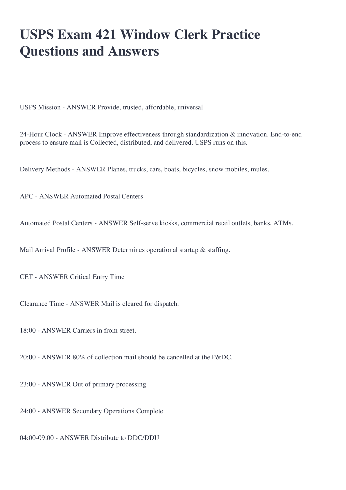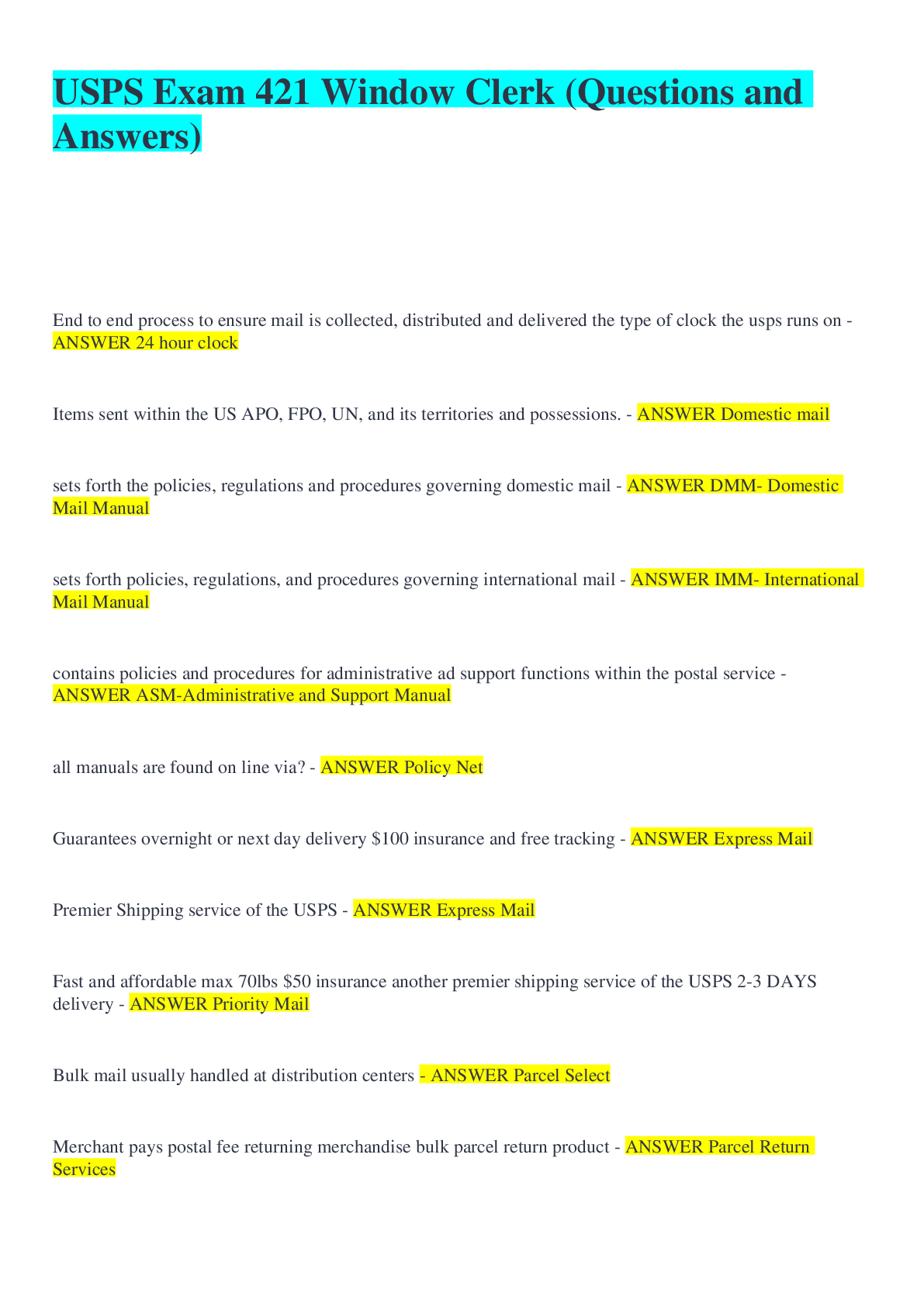Education> EXAM > USPS Exam 421 Window Clerk Practice Questions and Answers (All)