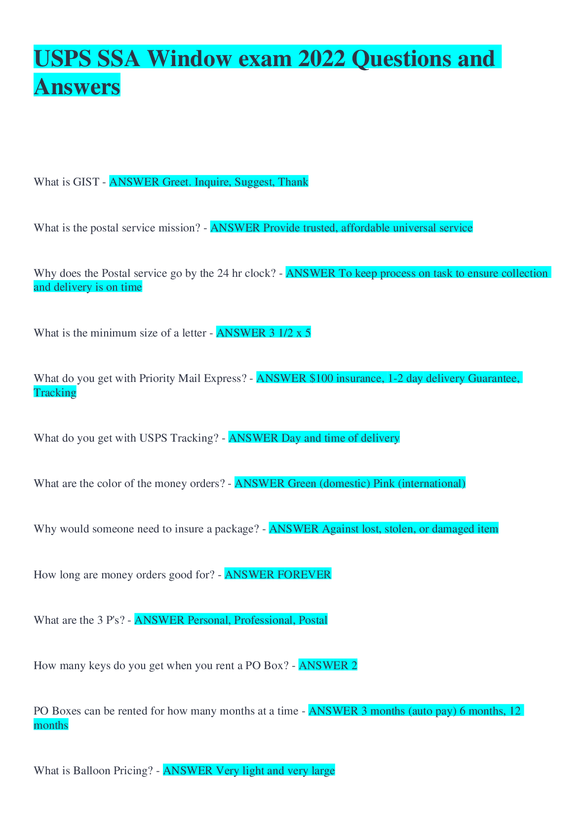 Education> EXAM > USPS SSA Window exam 2022 Questions and Answers (All)