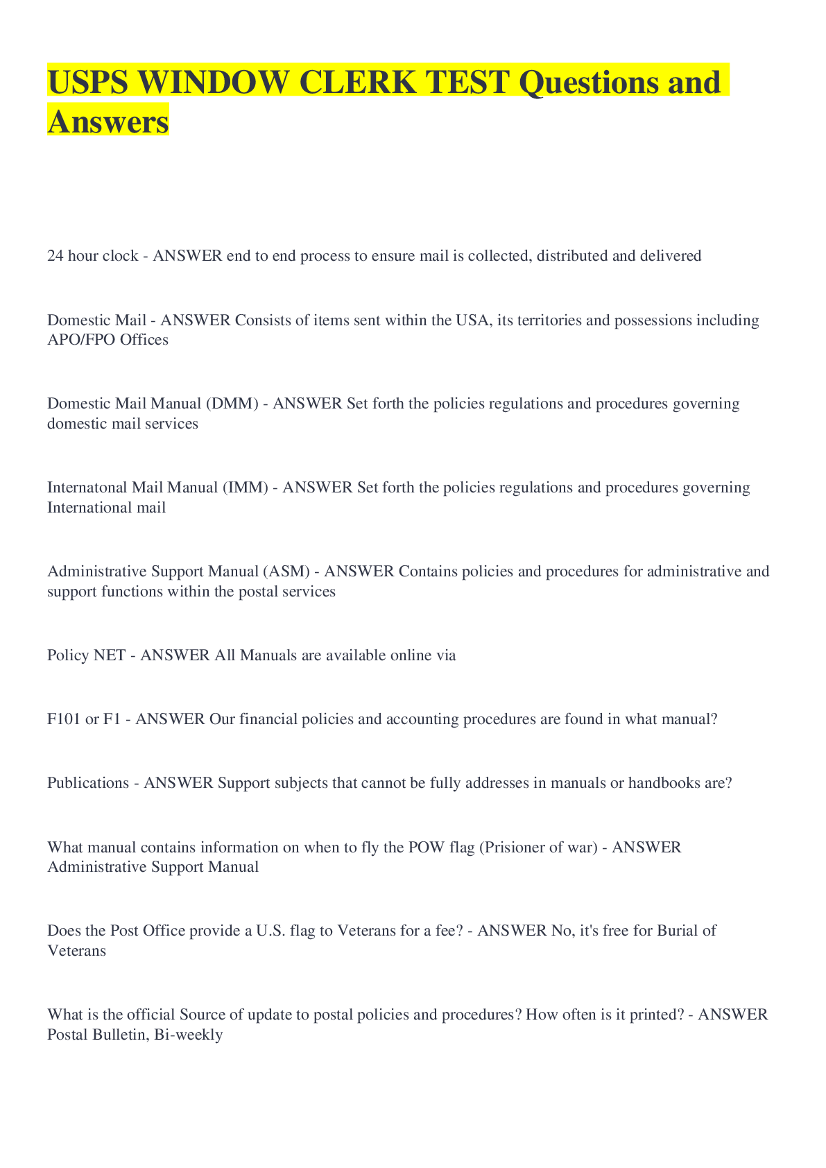 Education> EXAM > USPS Window Clerk/Retail ( Exam Questions and Answers) (All)