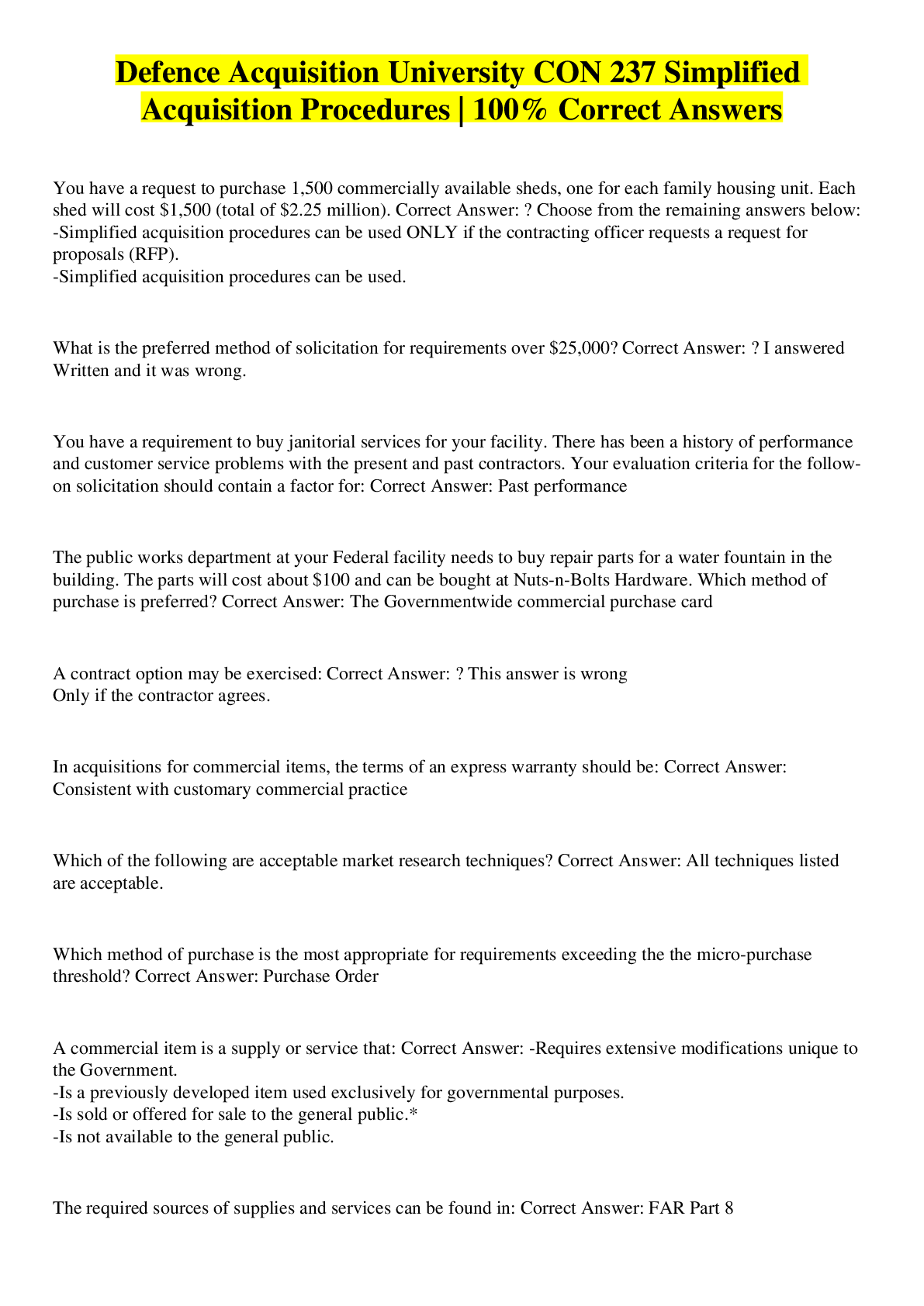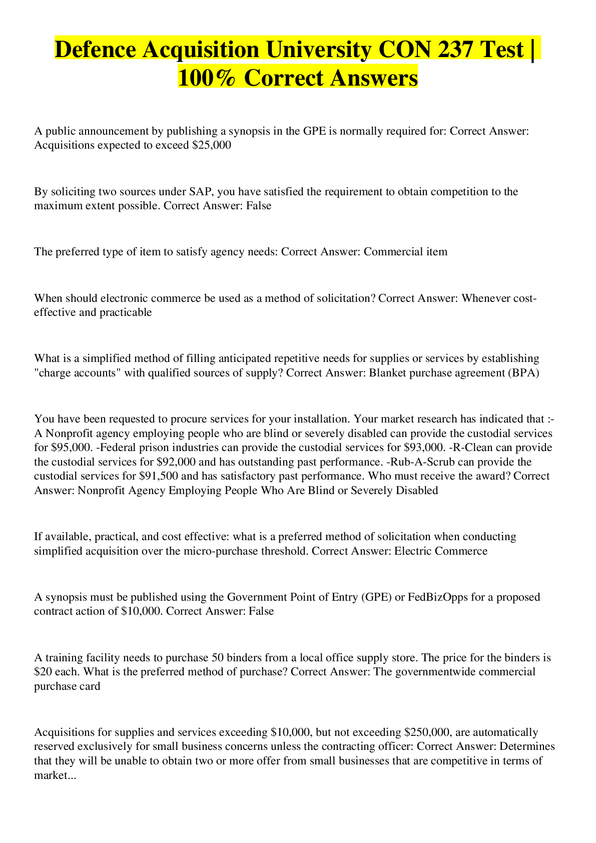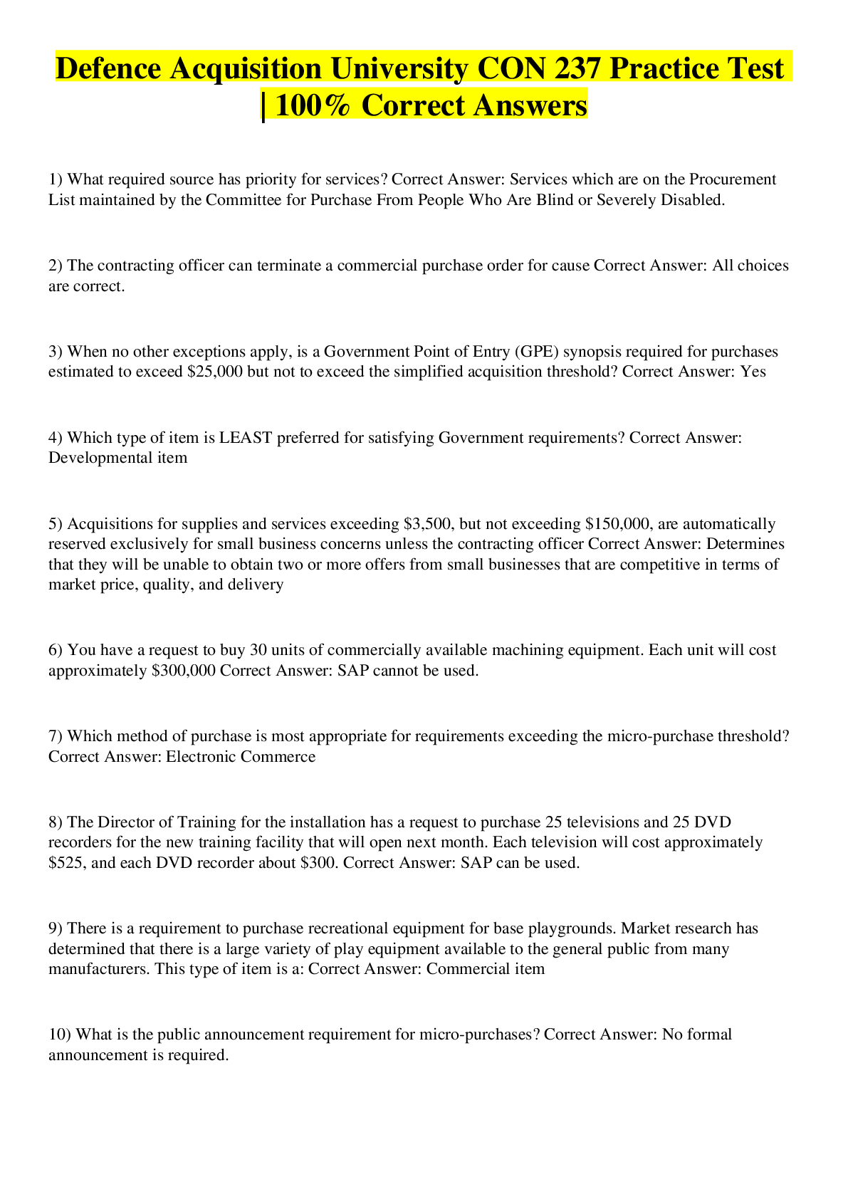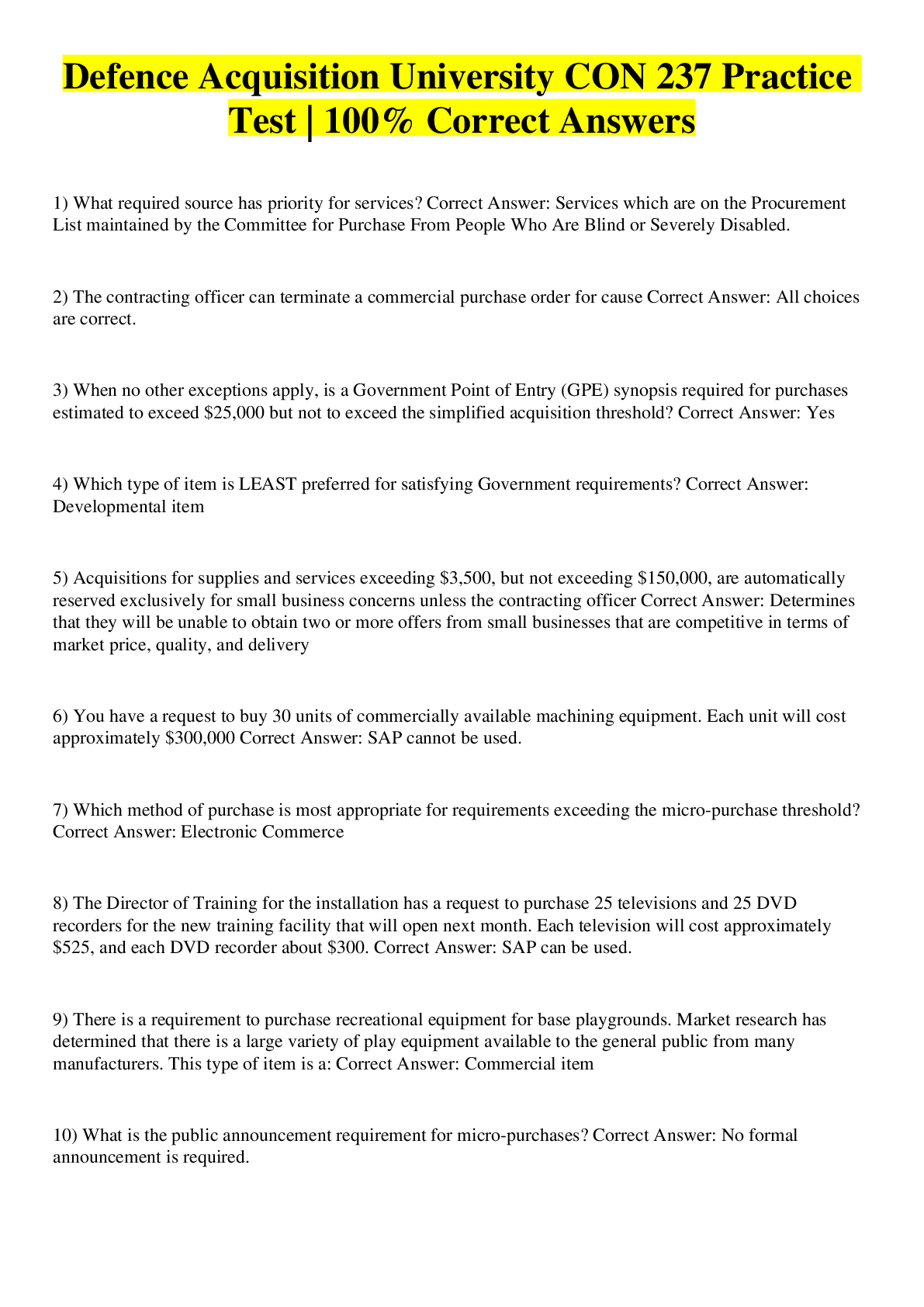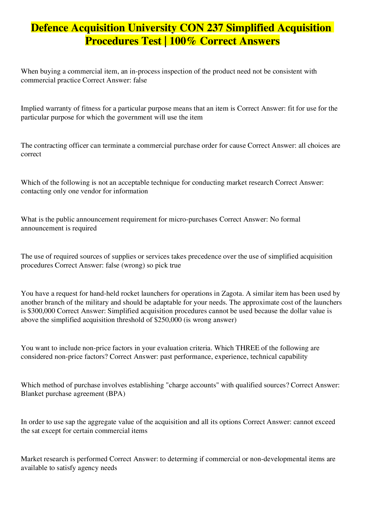 Education> EXAM > Defence Acquisition University CON 237 Simplified Acquisition Procedures | 100% Correct Answers (All)