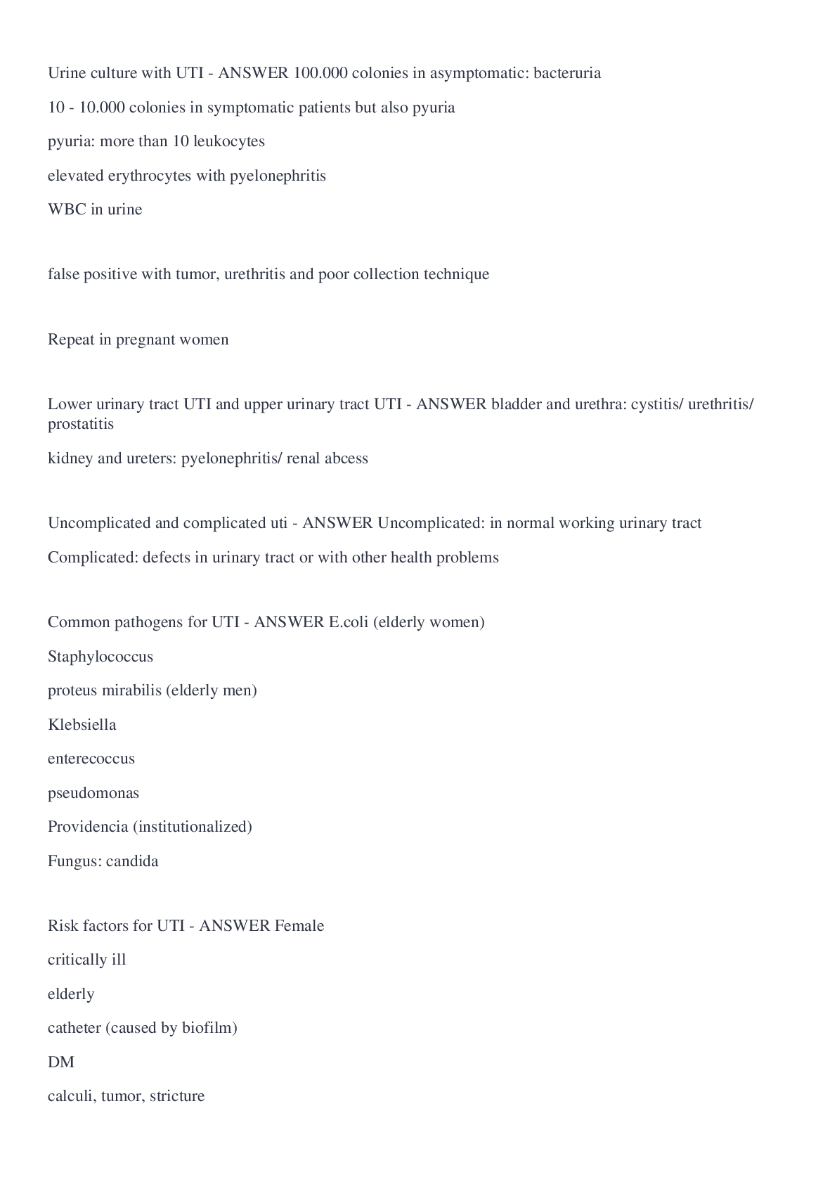 Urine culture with UTI - ANSWER 100.000 colonies in asymptomatic: bacteruria 10 - 10.000 colonies in symptomatic patients but also pyuria pyuria: more than 10 leukocytes elevated erythrocytes with...