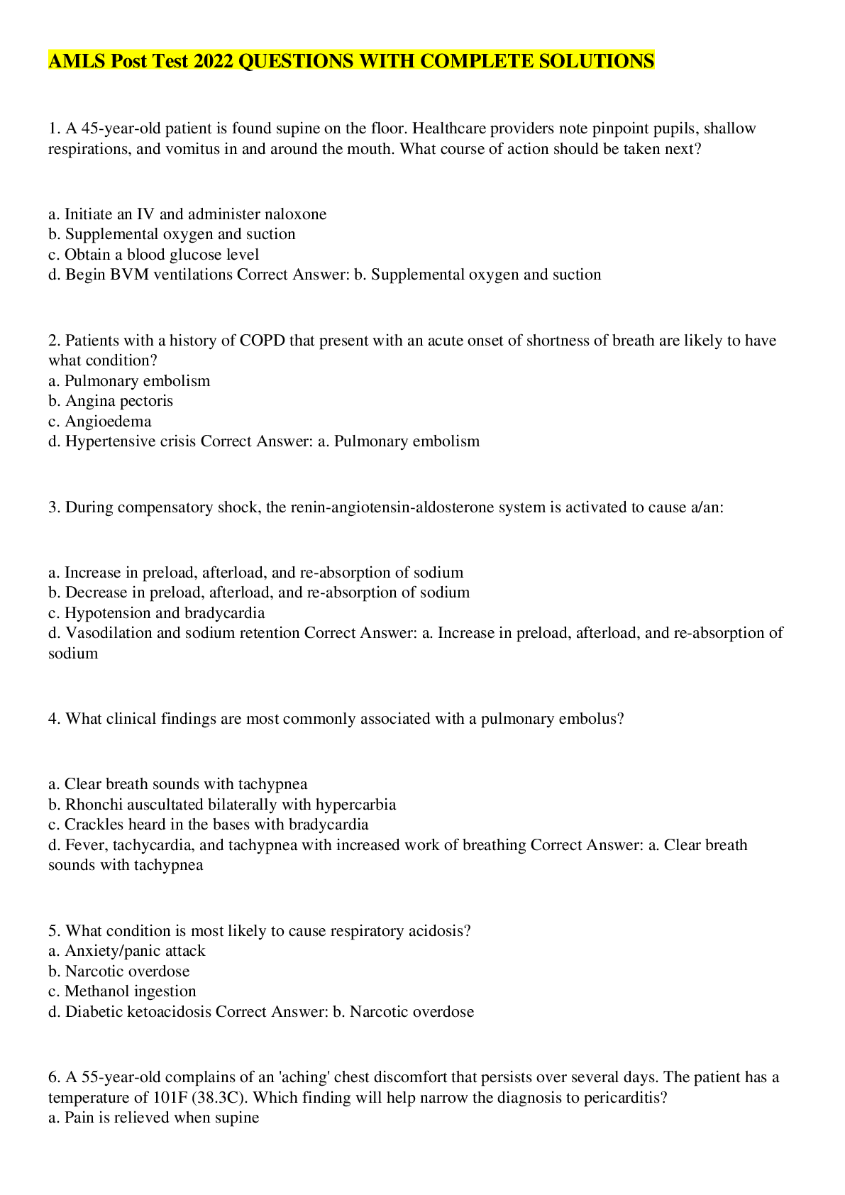 Health Care> EXAM > Advanced Medical Life Support AMLS Review QUESTIONS WITH COMPLETE SOLUTIONS (All)