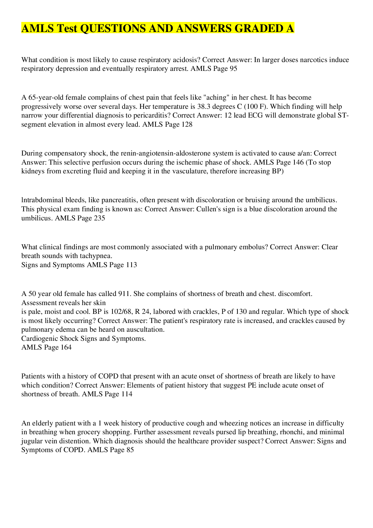 Health Care> EXAM > AMLS PRE-TEST (ALS) – STUDY QUESTIONS AND ANSWERS| GRADED A (All)