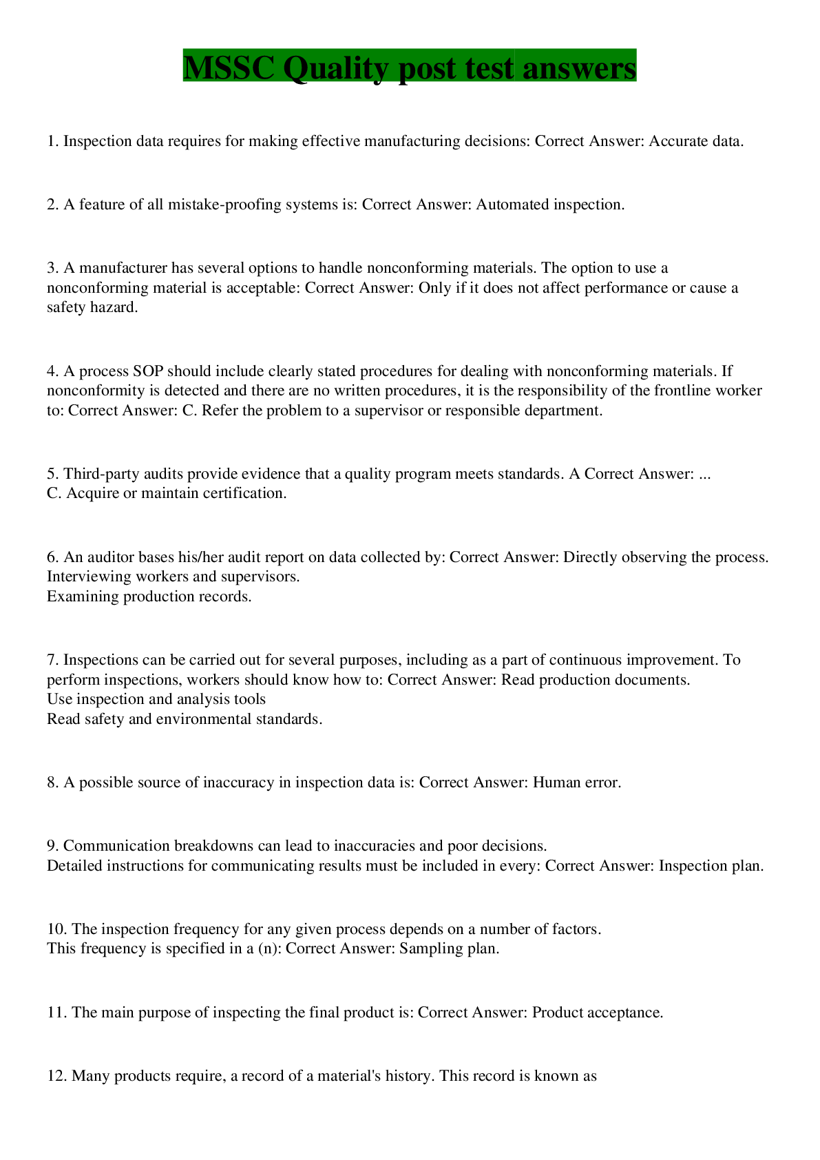 1. Inspection data requires for making effective manufacturing decisions: Correct Answer: Accurate data. 2. A feature of all mistake-proofing systems is: Correct Answer: Automated inspection....
