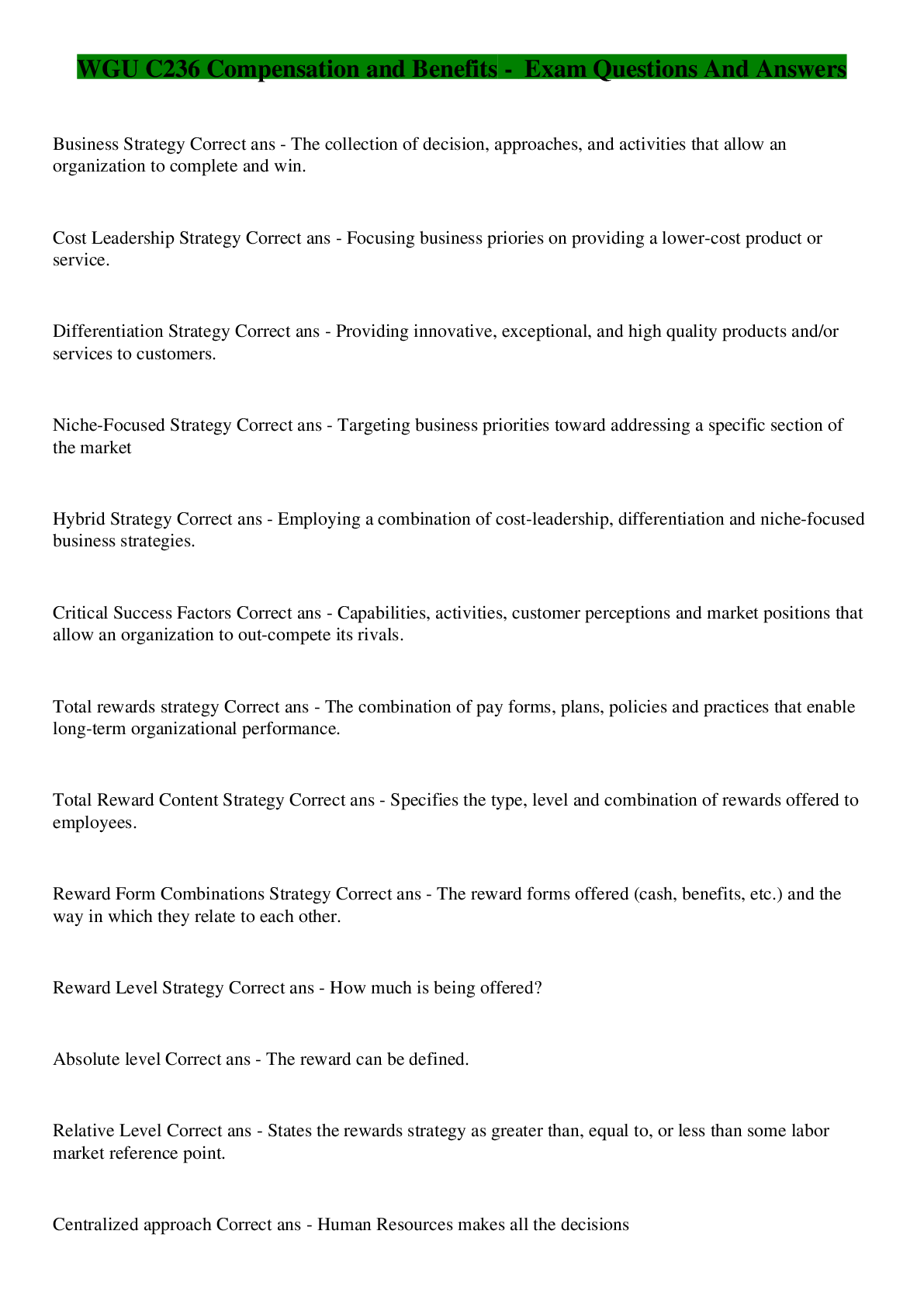 Health Care> EXAM > WGU C236 Compensation and Benefits - Exam Questions And Answers (All)