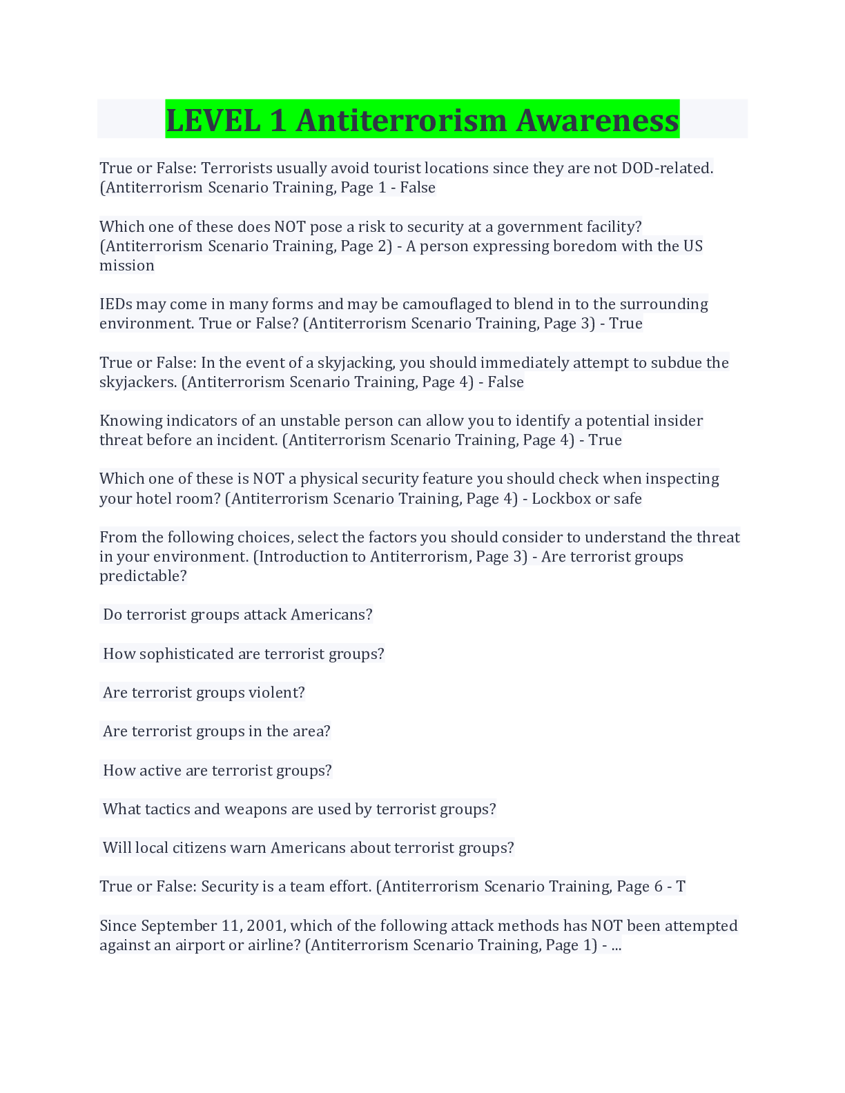 Law> EXAM > Level I Antiterrorism Awareness Training Practice Test Latest Update (All)