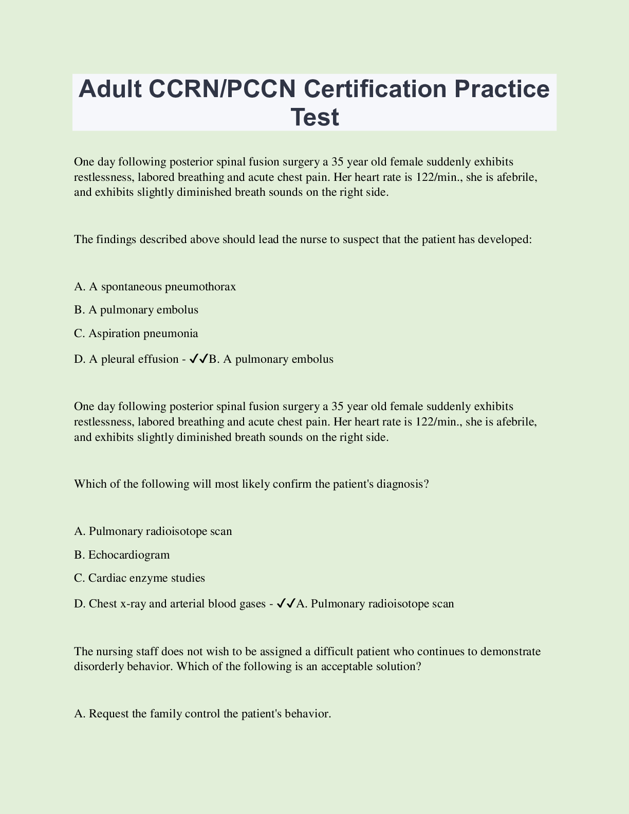 Health Care> EXAM > Adult CCRN/PCCN Certification Practice Test | 50 Questions with 100% Correct Answers | Updated & Verified (All)