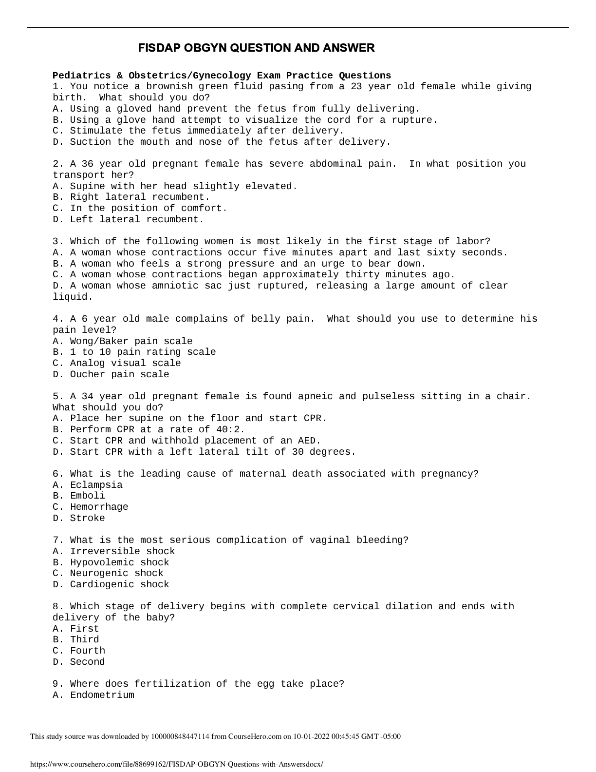 Health Care> EXAM > FISDAP OBGYN / Pediatrics & Obstetrics/Gynecology Exam Practice Questions with Answers 2021/2022 (All)