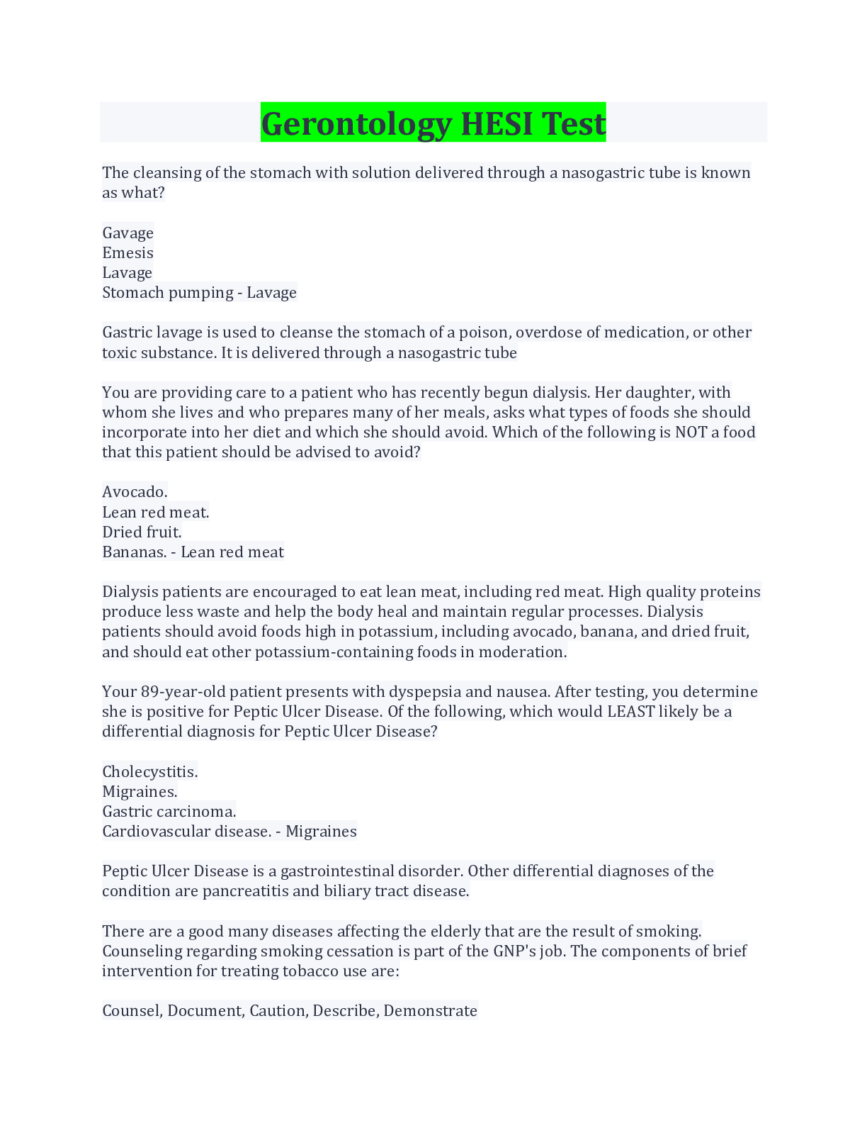 HESI Hints Only- Gerontology Questions And Answers With Complete Solution