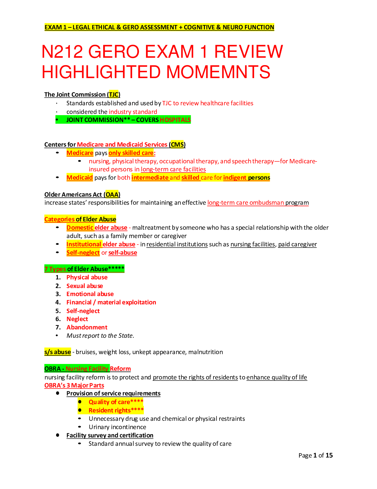 N212 GERO EXAM 1 REVIEW HIGHLIGHTED MOMENTS.LATEST 2020/21.EXAM 1 – LEGAL ETHICAL & GERO ASSESSMENT + COGNITIVE & NEURO FUNCTION Chapter 3, 4, 27 The Joint Commission ( TJC ) Standards establish...