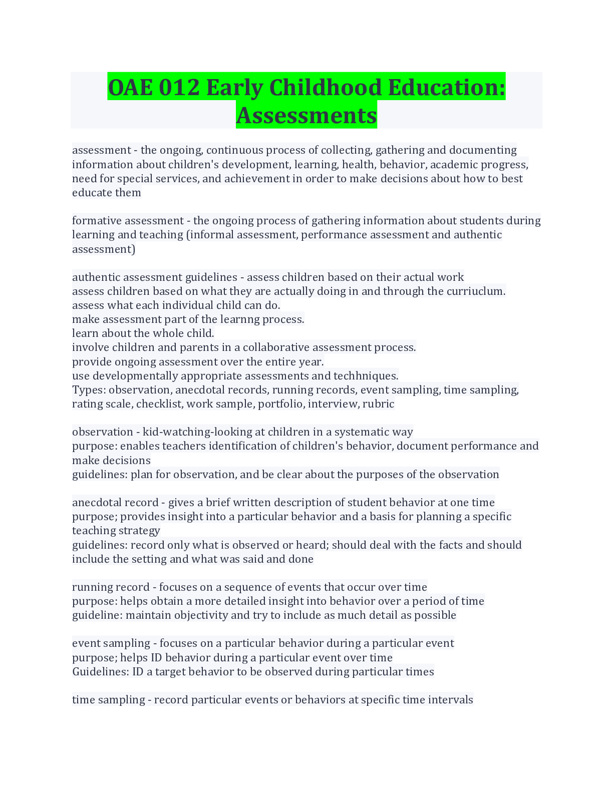 OAE 012 Early Childhood Education: Assessments Questions And Answers