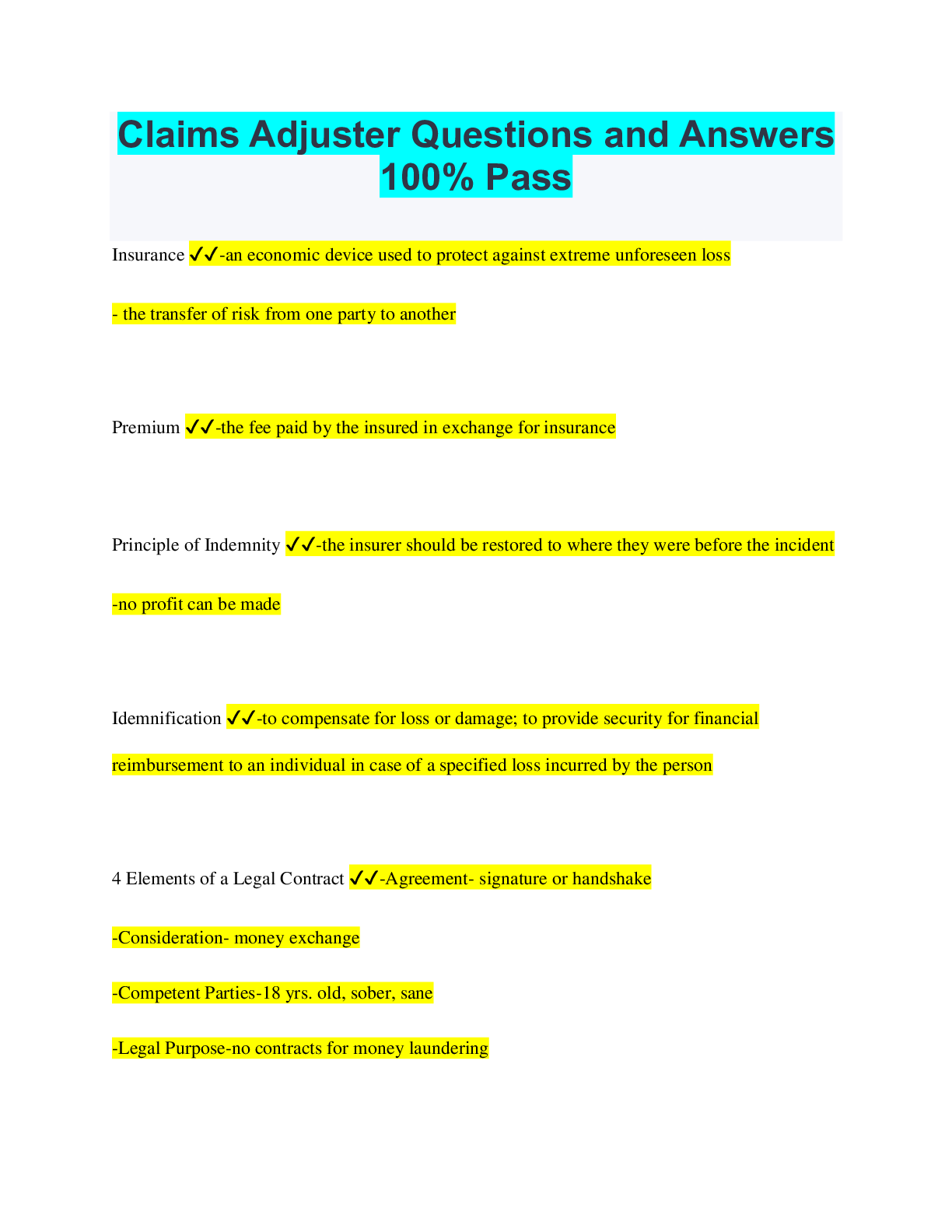 Claims Adjuster Questions and Answers 100% Pass Insurance ✔✔-an economic device used to protect against extreme unforeseen loss - the transfer of risk from one party to another Premium ✔✔-the fee...