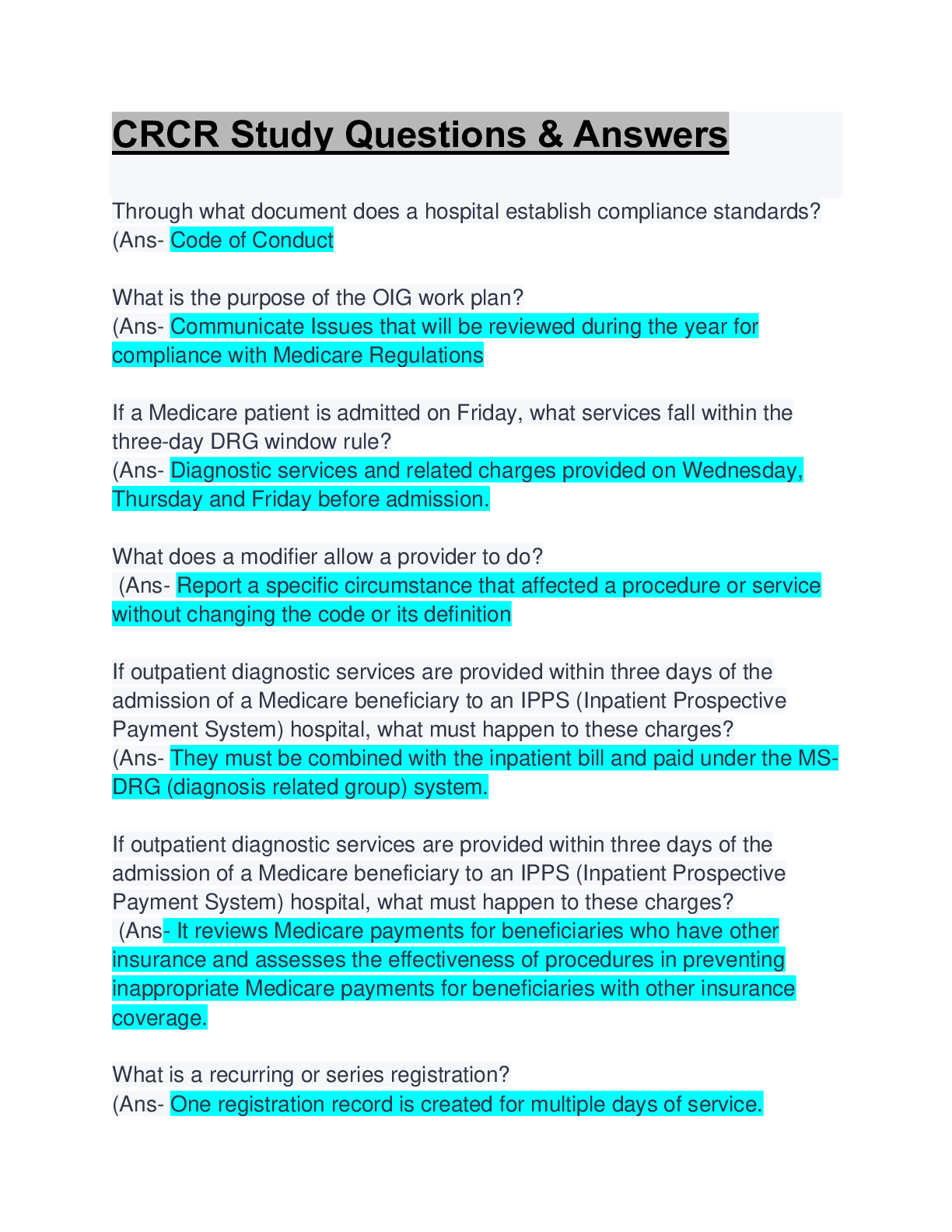 Health Care> EXAM > CRCR Study Questions & Answers: CRCR Study Guide: Latest Updated A+ Guide Solution (All)