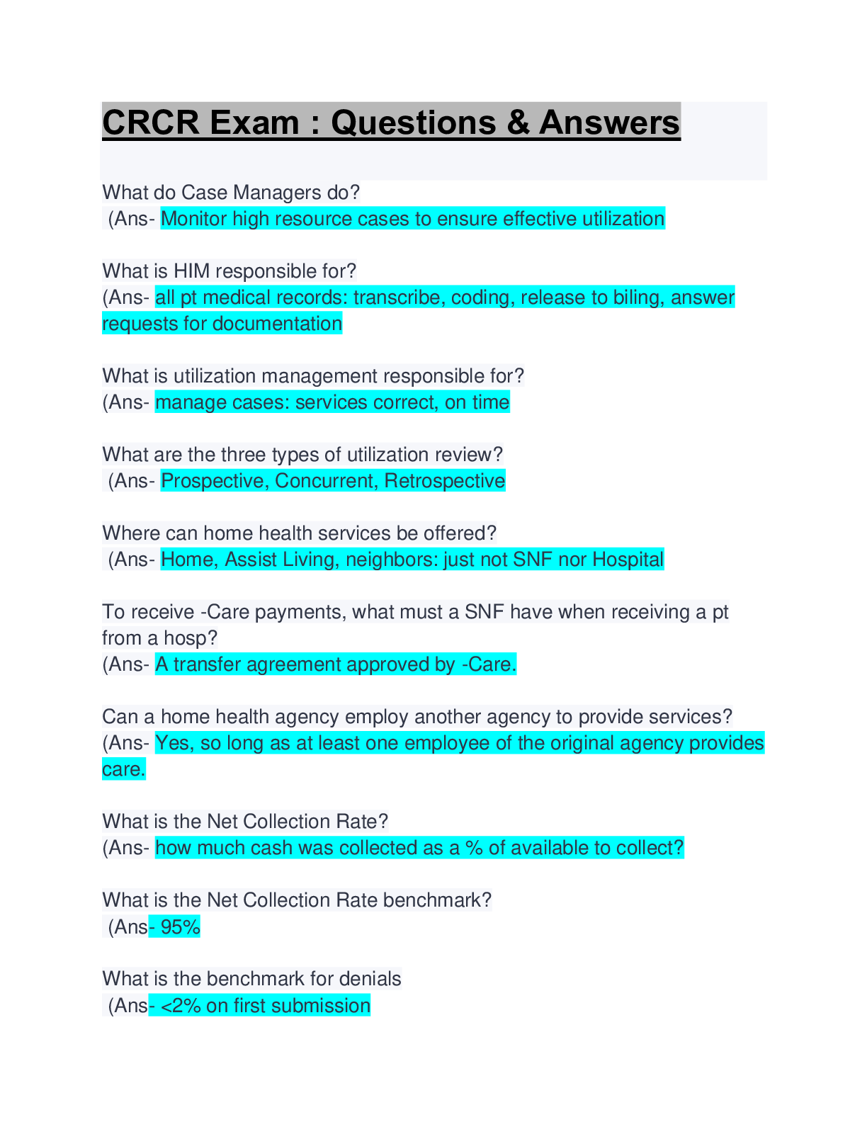 Health Care> EXAM > CRCR Exam Prep: Questions & Answers; Latest Updated A Plus Guide (All)