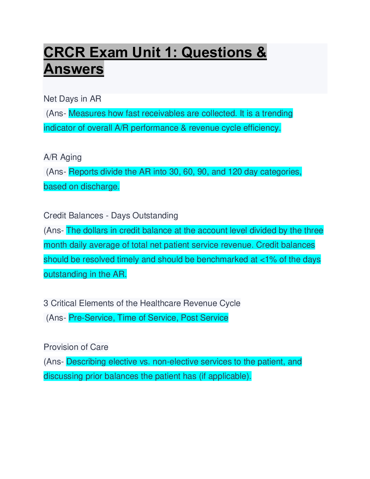 CRCR Exam: CRCR Exam Prep: CRCR Exam Unit 1:CRCR Unit 2:(Pre-Service Financial Care):CRCR Part 3(Time-of-service):CRCR 4 - Post-Service Financial Care - Quiz Combo: (Pre-Tests, KCs, Quizzes): CRCR Stu... dy: Questions & Answers [Show More]